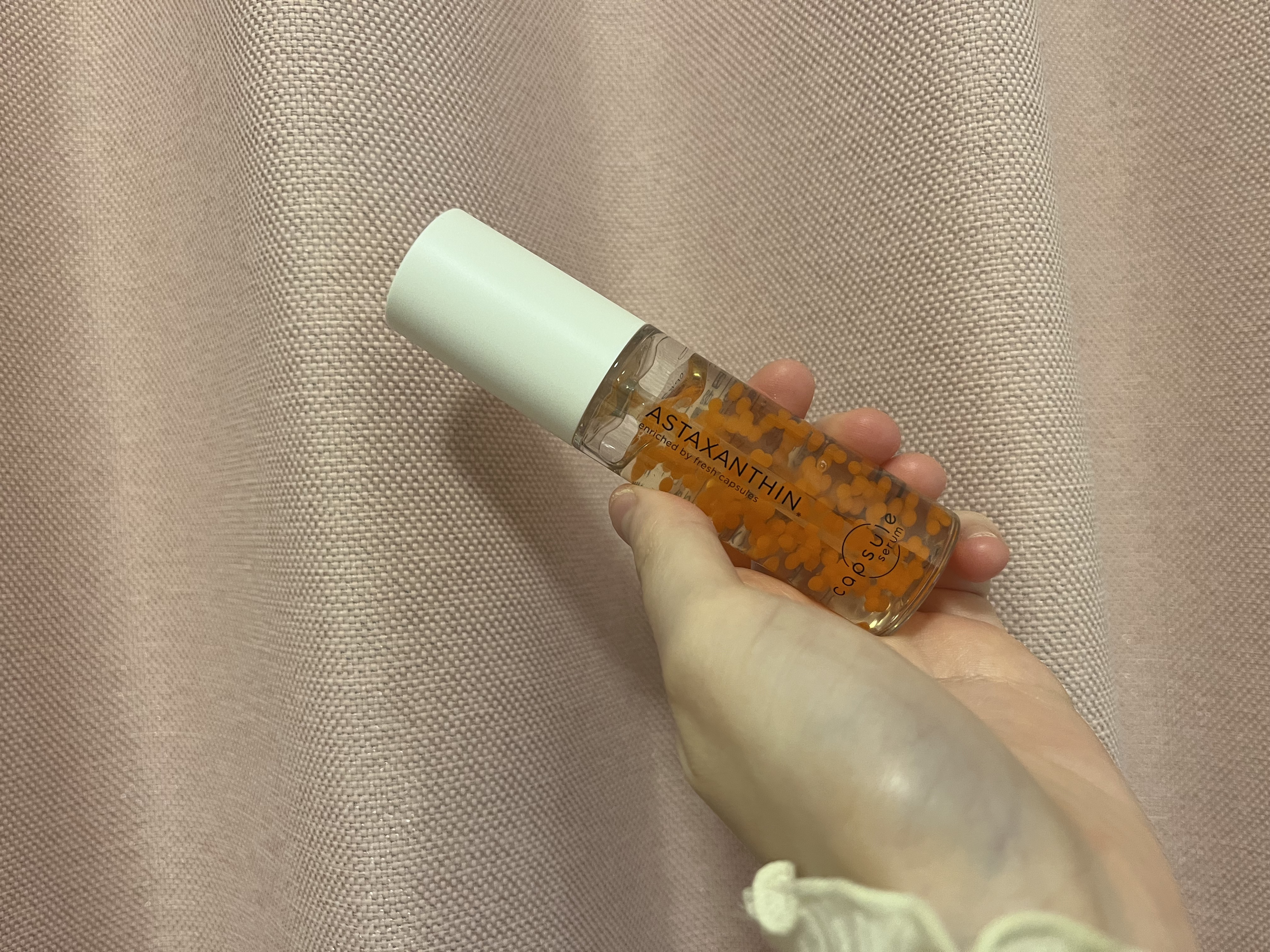 注目のエイジングケア成分アスタキサンチンを厳選配合 独自のカプセル製法によって成分が酸化しづらくなっていて出した時にカプセルが弾けて新鮮な美容成分を肌に届けることができるというセラム アスタキサンチンだけでなくビタミンC誘導体も配合されていてより相乗効果が期待できるよ