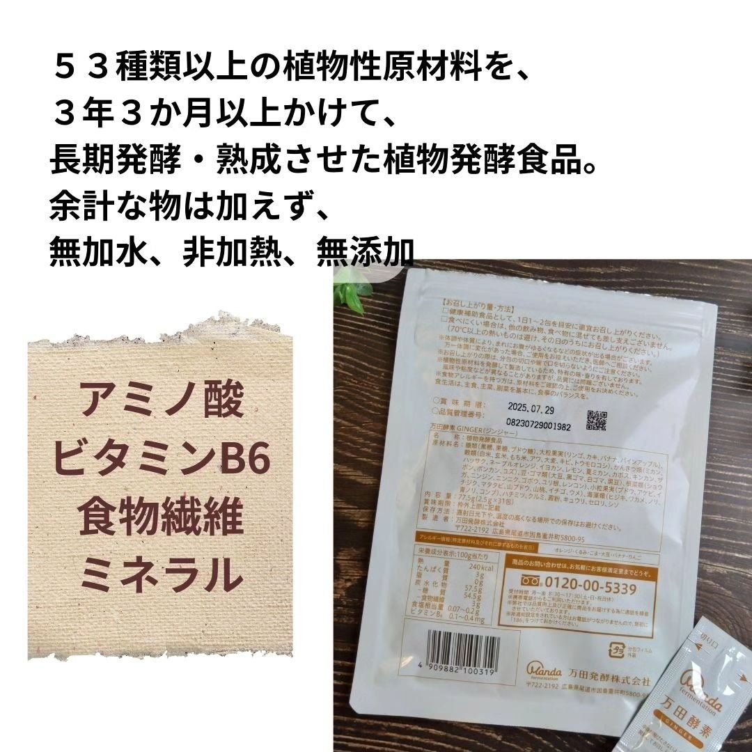 おいしいので続きやすいのが◎ 個包装になっているためポーチに入れておいて外出先でも飲めるのが良いと思いました♡ 特徴は、日本国内を中心に選びぬかれた53種類以上の植物性原材料をじっくり3年3ヵ月以上かけて発酵し熟成しています。余計なものは加えず、つくられています。 発酵させることでまろやかな味に仕上げているためショウガの辛みが苦手だなという方にも◎ 毎朝ヨーグルトに万田酵素 GINGER ペースト(分包)タイプをかけて食べています♡ヨーグルトとの相性がよいのでおすすめの食べ方です。