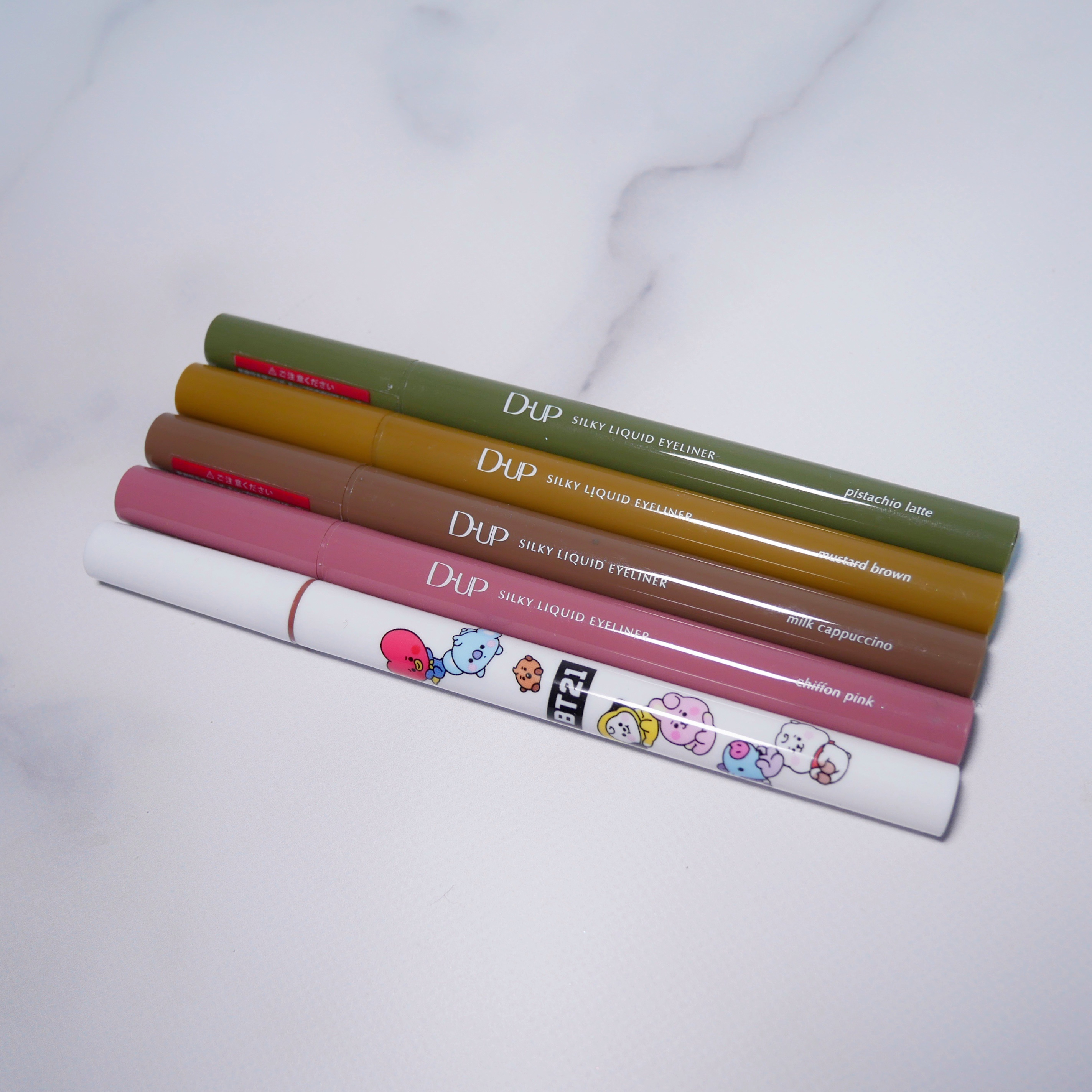 - 筆先までずっとなめらか、目尻で感動するリキッドアイライナー。 必要な量が肌にのる新設計で、まぶたの上をすべるような、滑らかな描き心地。しなやかでコシのある筆が、筆圧のコントロールを容易にし、太いラインも細いラインも思い通りに仕上げます。水、汗、涙に強いウォータープルーフタイプなのに、通常洗顔で簡単オフ。肌に色素が残らない顔料を使用。5種類の美容液成分を従来品の200%配合し、メイクしながら目元ケアまで。 ●ブラウンブラック ※2020年9月12日 バラエティショップ先行発売 ●漆黒ブラック ※2020年12月頃発売予定 ●ナチュラルブラウン ※2020年12月頃発売予定 ●シフォンブラウン 「毎日メイクに透明感と抜け感」 ブラウンでも、グレーでも、ベージュでもないニュアンスカラー。 自然な印影で素の目元を際立て、頑張りすぎない、ふんわりとした目元に。 ●アプリコットブラウン 「じゅわっと血色感。 肌に馴染むおしゃれカラー」 温かみのあるアプリコットがじゅわっと滲む血色感を目元に演出。 肌馴染みが良いので、カラーライナーに抵抗がある方もブラウンの延長線上で楽しめる、使いやすい色味です。 ”ちょっとオシャレ”な空気感を演出するカラー。 ●ピンクショコラ アイライナー 「ピンクが溶け込む濃厚ブラウン」 肌馴染みが良く、目元にじんわり血色感をプラス。 さりげなく女性らしさが加速するようなカラー。 ●ピスタチオラテ (2022年7月29日(金)発売) 「“目尻”に抜け感アクセント」 肌に馴染むのに映える絶妙なグリーン。 トレンドカラーに“くすみ”と“抜け感”をプラスしたまろやかな発色。 ●マスタードブラウン 「“イエロー”が揺れる、大人の洒落色」 (2022年7月29日(金)発売) まるで太陽のような暖かさを感じる新しいブラウン。 ほんのり感じるイエローでメイクが一気に垢抜ける稀有な色。 ●シフォンピンク(2023年2月10日発売) 「ふんわり柔らか"まろみピンク"」 甘くなりすぎない青みニュアンスで目元の透明感UP。 目元を引き締め、ピンクメイクにありがちな腫れぼったさを解消。 ●ミルクカプチーノ(2023年4月21日発売) まろやかな深みの“優しい締め色” どんなメイクにも合わせやすいカラー。 自然な陰影でさりげなく目幅を拡張します。 ●グレーカシミア(2023年10月1日発売) ブラウンがほんのり溶け込んだ、暖色グレー まろやかな発色で、パーソナルカラーを問わず肌に馴染む 目元の陰影になりすまし、抜け感と目力を欲張りに叶える ●ダークフィグ(2024年6月1日発売) するする”なめらか。描きやすいのに、落ちにくい。 クッキリ可愛いほの甘ダークブラウン ●ピーチモカ(2024年8月1日発売) ふわっと自然に盛れる“桃色ブラウン” ほんのり血色感で目元にうるみ感を演出 ●スターダストブラウン(2024年12月11日発売) キラッと繊細に輝く''星屑ブラウン'' 透け感のあるダークブラウンの色味とラメの輝きが、目元に艶のある立体感を演出 ●チャコールモカ(2025年4月10日発売) 目元を締める''深みグレージュ'' 黄みや赤みに偏りすぎない絶妙な色設計で、自然に目元を強調
