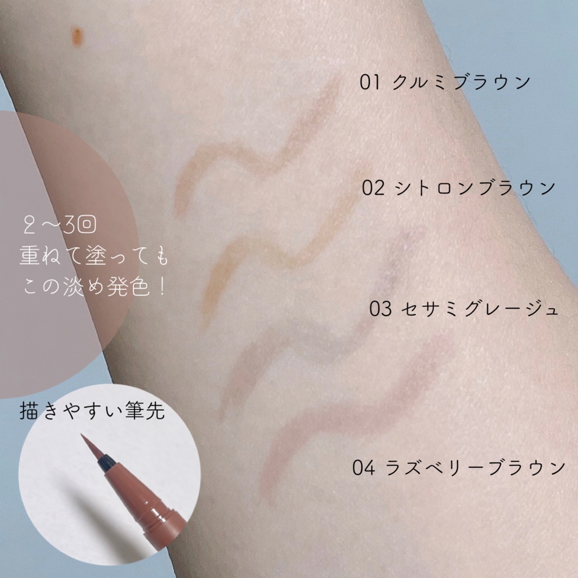 - 炭パウダー配合!ふんわり眉が長時間つづくリキッドアイブロウ! リキッドだけどテカらず、パウダリーな仕上がり。 リキッドだから眉尻まで長時間消えにくい! 本物のまゆげにみせる自然な薄付き発色 01 クルミブラウン…迷ったらこれ!使いやすい人気のブラウン 02 シトロンブラウン…明るめ黄みブラウン 03 セサミグレージュ…少し暗めのやわらかいグレージュ 04 ラズベリーブラウン…可愛い印象になるピンクブラウン