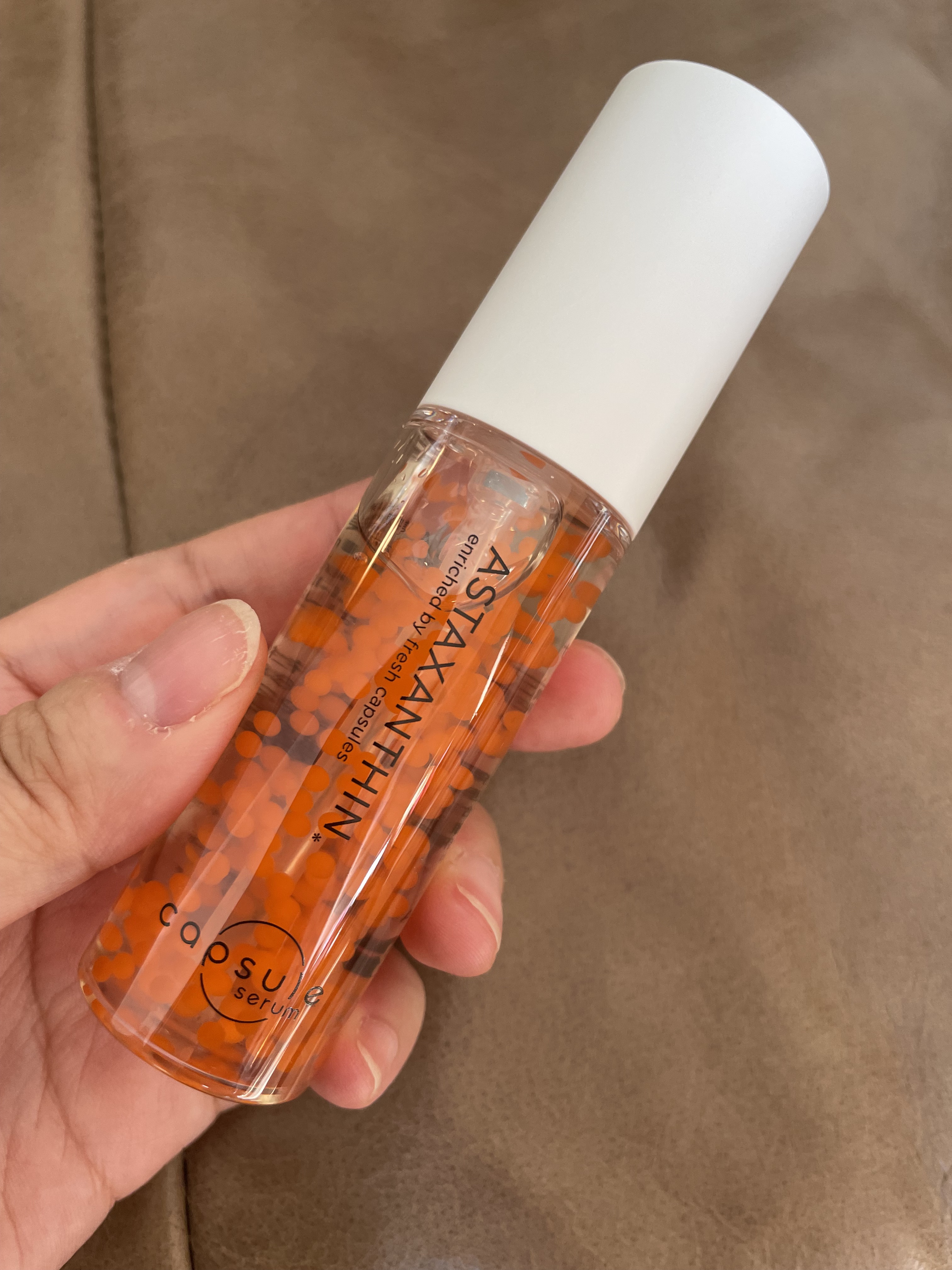 \プチッと、はじける「生」美容液🧡/#PRカプセルセラム様から#提供いただきました🎁独自のカプセルに包まれたアスタキサンチン成分がプチッと弾ける美容液🧡使い心地はすごいしっとりなめらかで、手に吸い付くような仕上がりに🙌✨⟡.·*.······...