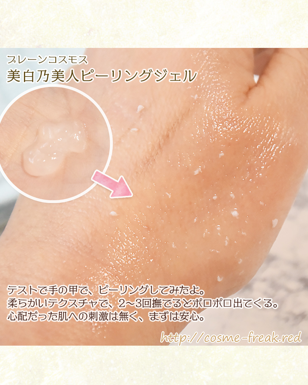 美白乃美人のホワイトニングピーリングジェルはマイルドな使い心地で私に合ってました◎ 顔にジェルを塗り広げて、少しおいたらやさしく撫でるとジェルが白くポロポロとしてきて、角質ケアができます。 頻度はやりすぎず、週2〜3回の使用がよいそうです😌 美白有効成分の水溶性プラセンタエキスも配合されていて、美白ケア出来るのも嬉しい☁