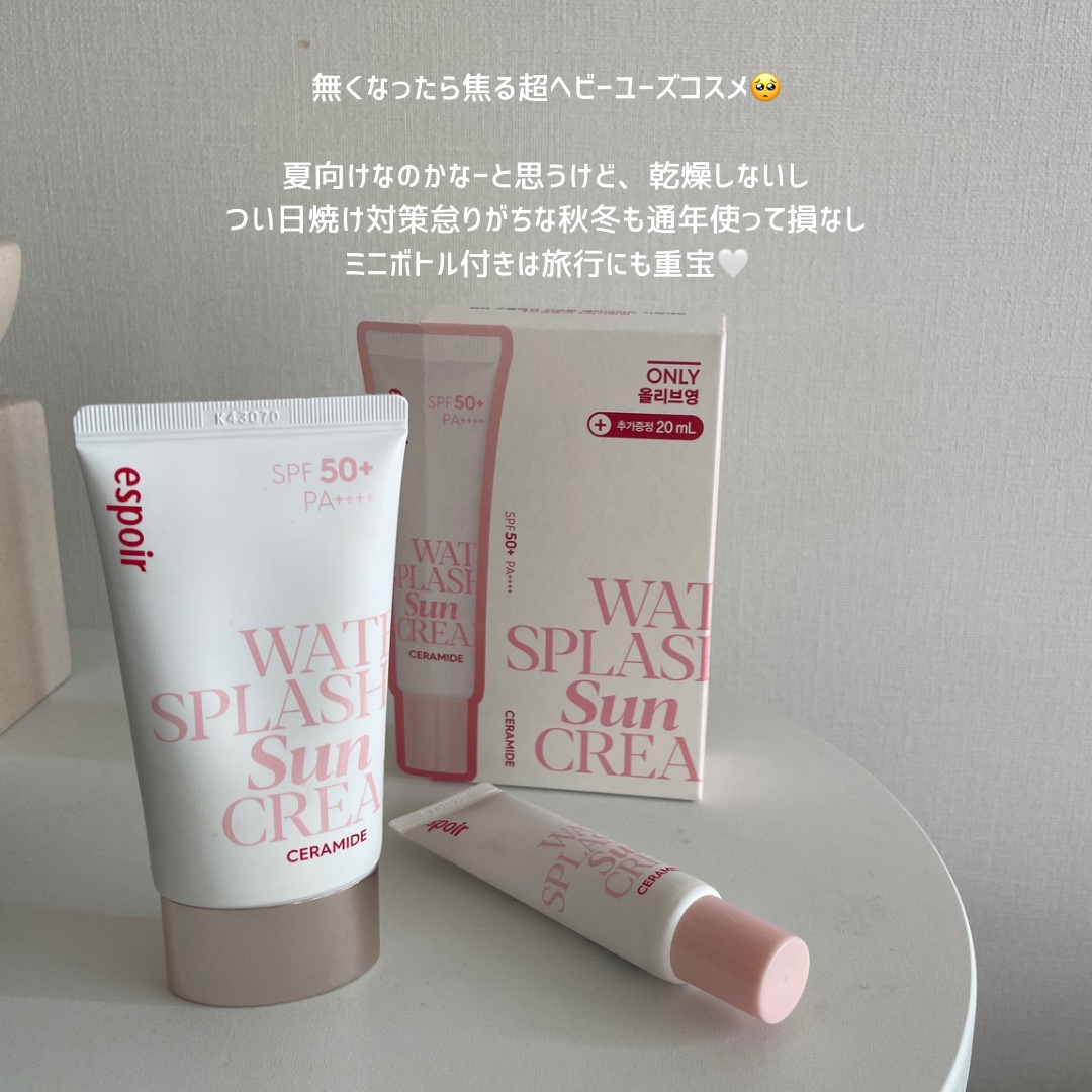 espoir日焼け止め🤍🤍🤍🤍🤍🤍🤍🤍🤍🤍『よいけどベタベタするよトーンアップ感』娘💗言ってたespoirウォータースプラッシュサンクリームセラミド60mlエスポア下地気になってる方はチェックしてみてください※個人の感想です#espoir#ウ...