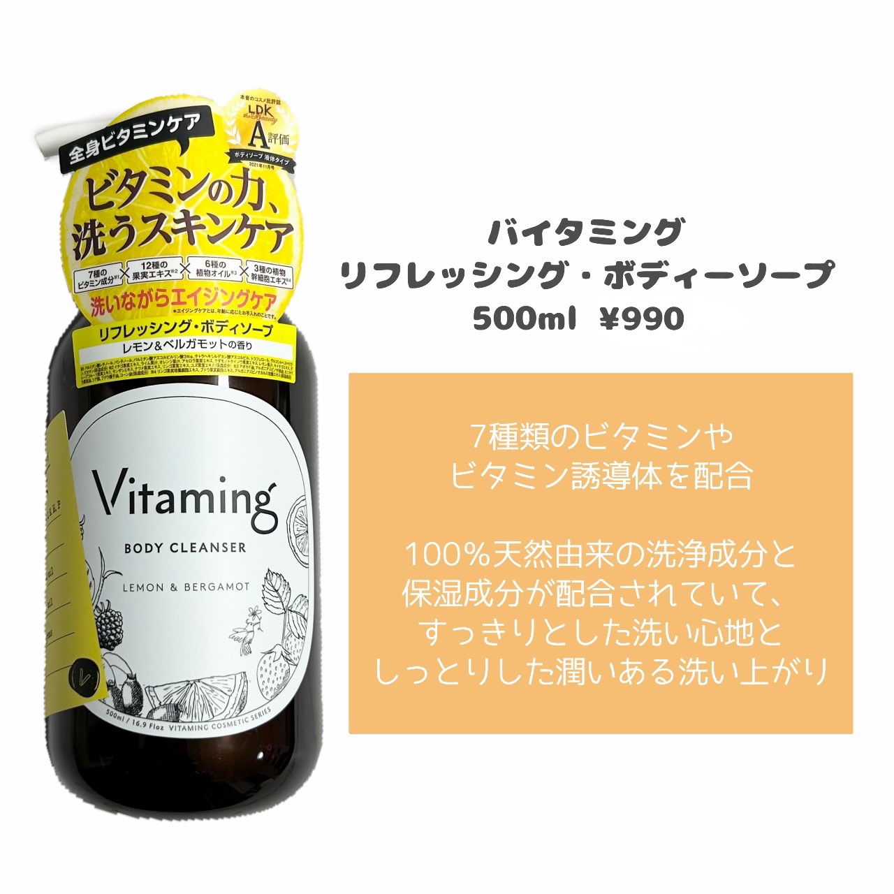 Vitamingは人間に必要な『ビタミン』に特化しており、天然由来100%の洗浄成分、全身ビタミンケアができます。 少量でも、もこもこに泡立つのでコスパも良さそうです🫧 洗い上がりはさっぱり、お風呂上がりは爽やかな香りが身体を包んでくれます☺︎︎