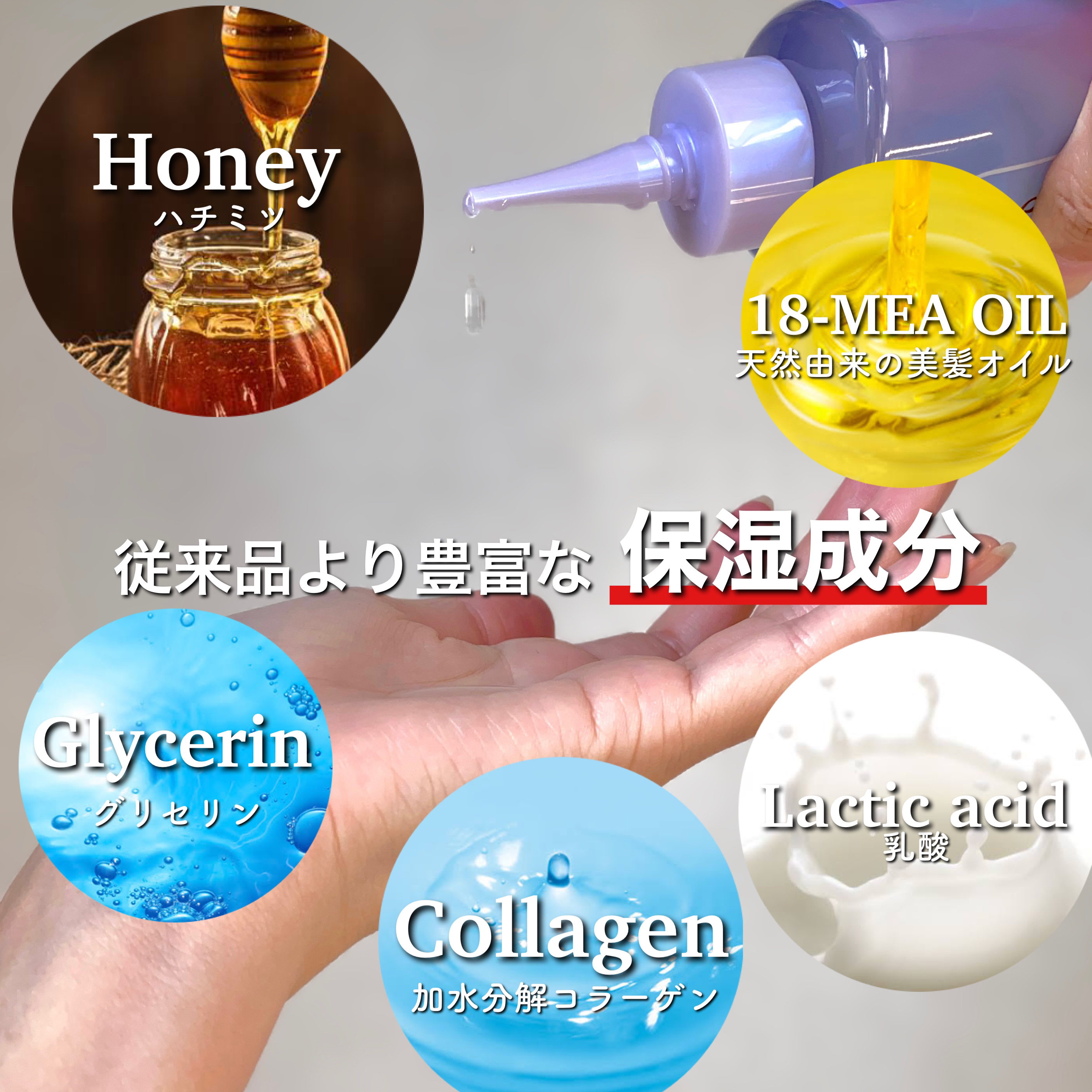 - <200ml> 水、エタノール、DPG、加水分解コラーゲン、ハチミツ、グリセリン、ラノリン脂肪酸、乳酸、ポリシリコーン-29、ポリシリコーン-9、ポリクオタニウム-37、フェノキシエタノール、香料 <つめかえ用 340ml> 水、エタノール、DPG、加水分解コラーゲン、ハチミツ、グリセリン、ラノリン脂肪酸、乳酸、ポリシリコーン-29、ポリシリコーン-9、ポリクオタニウム-37、フェノキシエタノール、香料