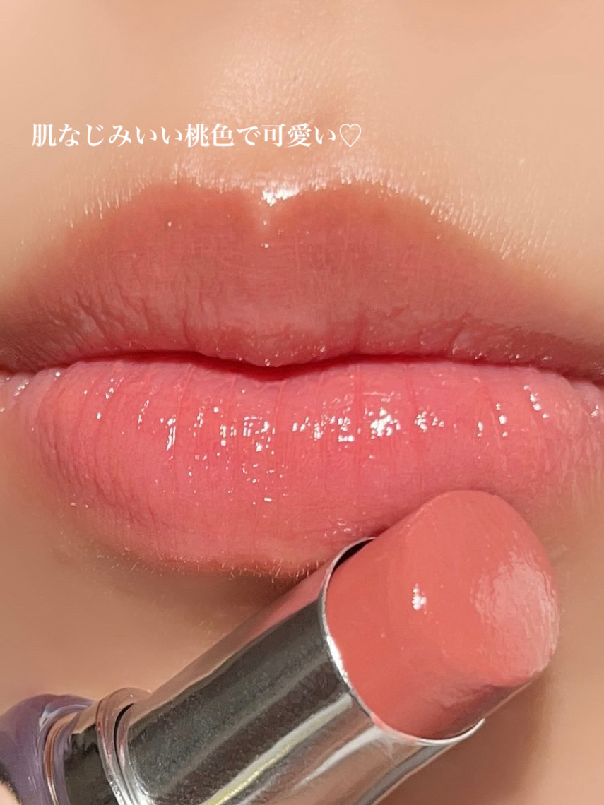 ねっちょりボリューム感あるテクスチャーだけど、ベタつきなく使いやすい。 ティントじゃない普通のグロスだから色もちは良くない。 発色ナチュラルだからこれだけでもいいけど、他のリップと合わせても可愛い!!