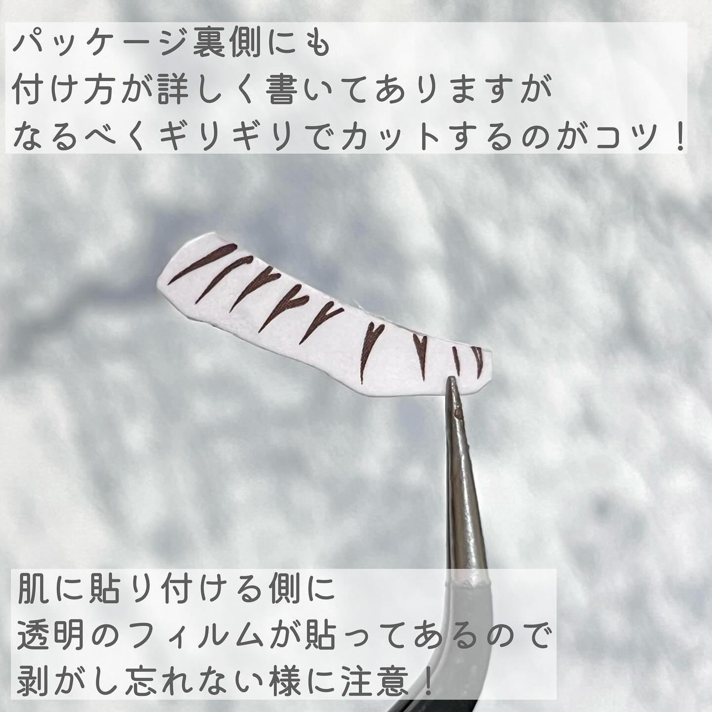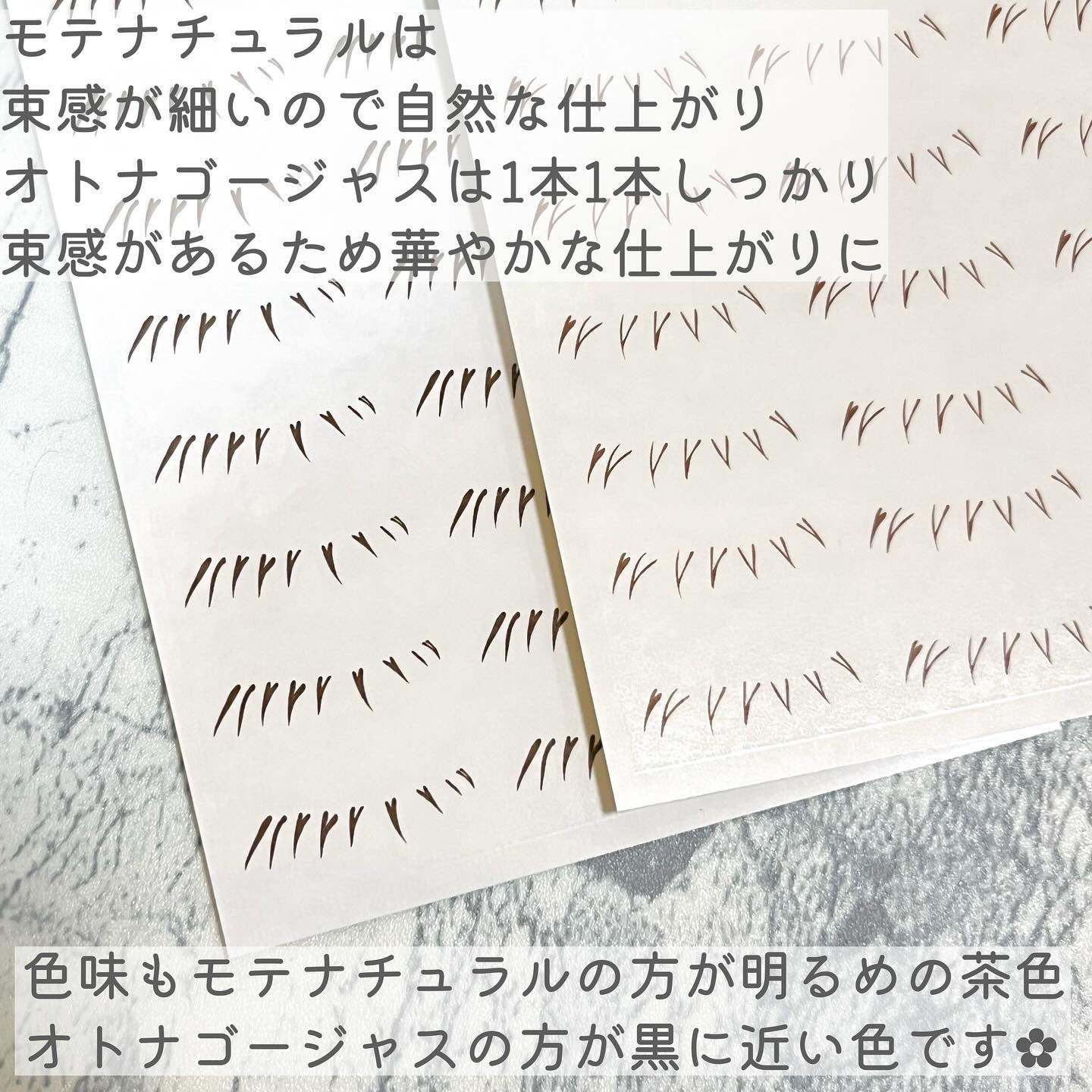 モテナチュラルは束感が細いので自然な仕上がり。 オトナゴージャスは1本1本しっかり束感があるため華やかな仕上がり。 使用方法は簡単! カットして水に濡らして貼るだけ。 アイラインで下まつ毛描くよりもヨレにくくて持ちがいいよ。 少しテカリが気になるけど上からアイシャドウ載せたらカバーできる◎