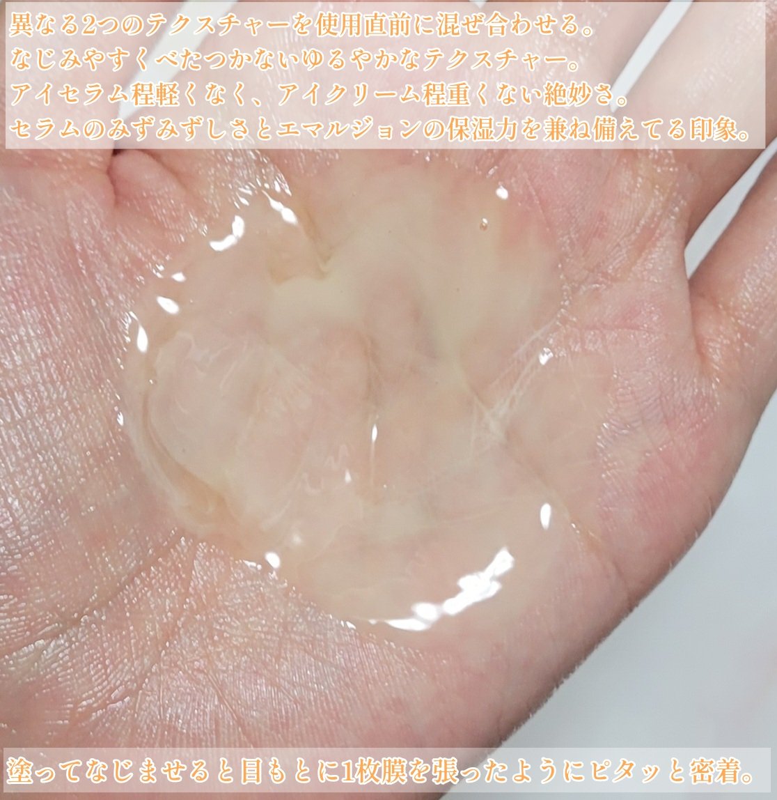- 揺るがない⽬もとへ 美を育む、次世代ダブル質感。 異なる2相のテクスチャーを使⽤直前に混ぜ合わせるスタイルは、ダブル セーラムが ずっとこだわり続けててきたもの。絶妙なバランスでエマルジョンとジェルが出会い、⽬もとにすっとなじみ、肌の奥深く*4まで浸透します。 内側*からあふれるようなうるおい、ハリに満ちた輝き 。⾒惚れるような、印象深い⽬もとへ。 * ⾓層
