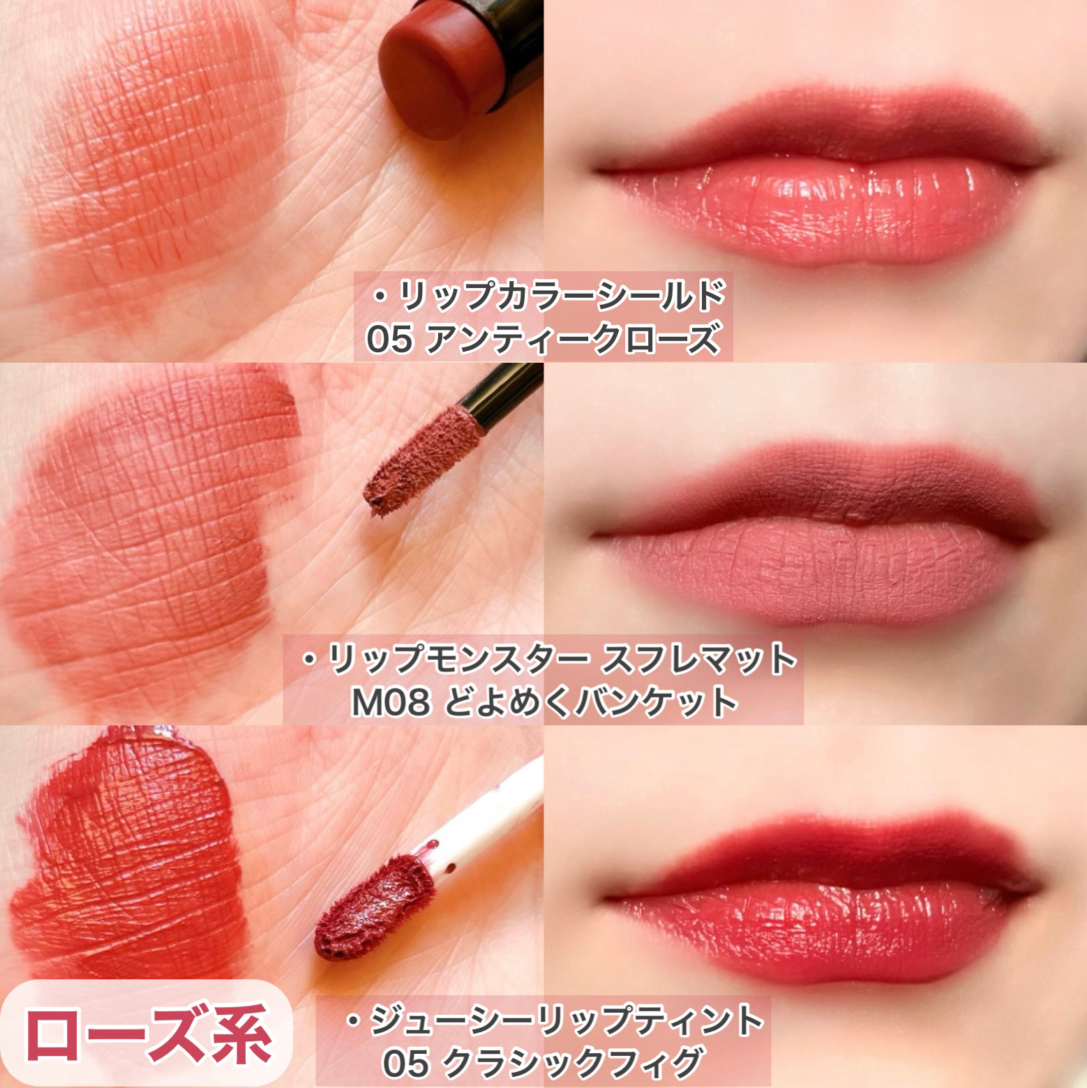 新色は大人かわいい上品な2つのカラー❤️ 06 #ピンクベージュ ナチュラルでどんな場面にも合うような万能なカラー✨ 上品な印象になる仕上がりです💖 07 #ビターレッド 深みのある大人っぽいカラー✨ 華やかな印象になる仕上がりです💖 01 #ナチュラルピンク 女性らしい華やかな印象になるピンク 02 #コーラルレッド 垢抜けたおしゃれな印象になるコーラルレッド 03 #ベージュブラウン 知的で大人っぽい印象になるベージュブラウン 04 #キャメルオレンジ こなれた印象になるオレンジ 05 #プラムレッド 洗練された印象になる青みレッド 色持ちも良くて、ティッシュオフするとマスクにもつきにくくておすすめリップです😊
