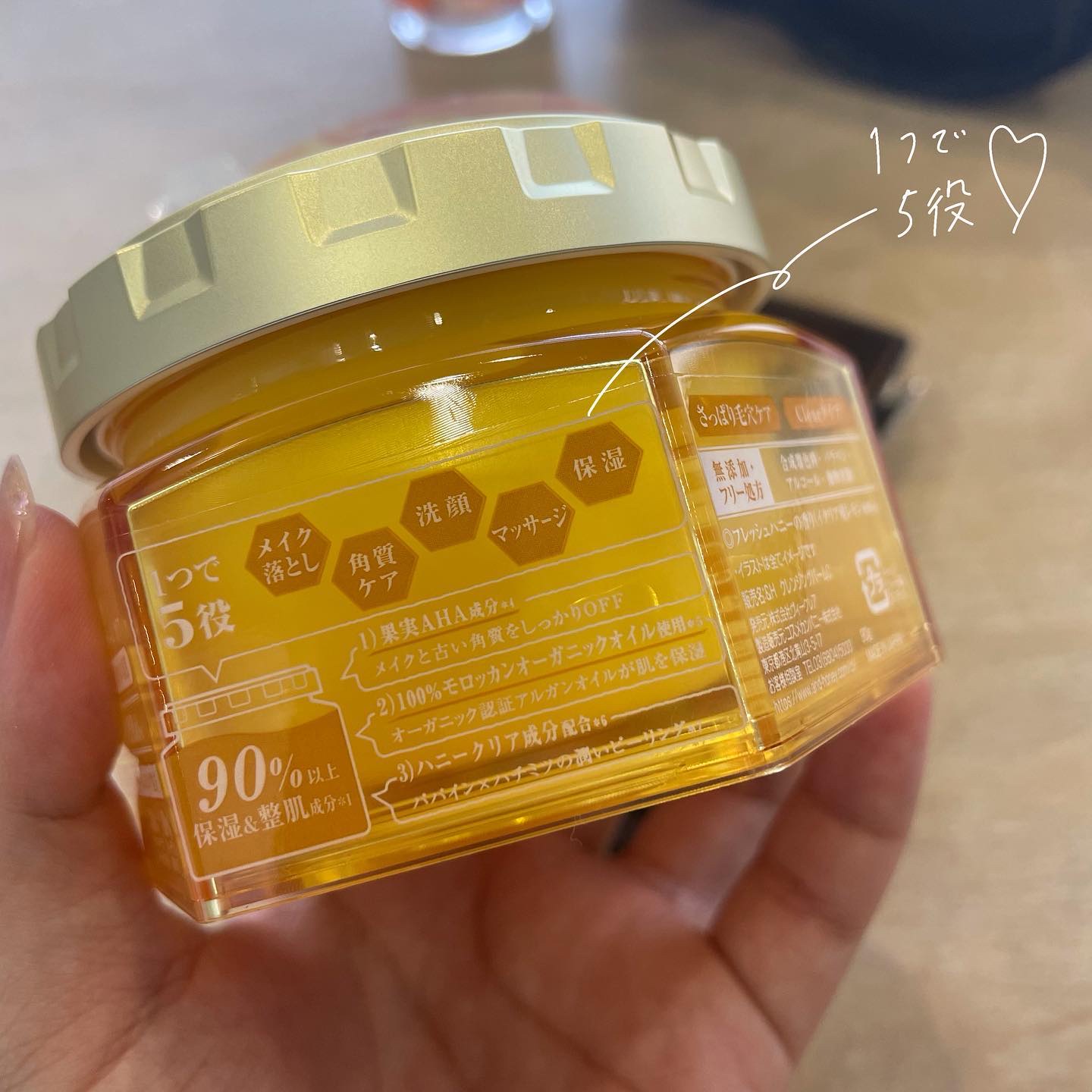 - クレンジングバーム クリアは、さっぱり毛穴ケアシリーズ。 パパイン*1とハチミツ*2の潤いピーリング効果*3により、さっぱりとしたクリアな肌へ導きます。 さらに製品の90%以上※1をハチミツ*2やアルガンオイル*4、オーガニックヒアルロン酸*5などの保湿&整肌成分で構成し、ハニークリア成分*6が、毛穴汚れ・皮脂をケアします。 【商品特長】毛穴汚れをしっかり落とし、さっぱりとしたクリアな肌へ導きます 【仕上がり】さっぱり 【おすすめの方】毛穴ケアしたい方 【香り】フレッシュハニーの香り ※1 基剤を除く、水を含む *1 角質ケア *2 保湿 *3 肌表面の古い角質の洗浄 *4 アルガニアスピノサ核油(保湿) *5 加水分解ヒアルロン酸(保湿) *6 パパイン(角質ケア)、ハチミツ(保湿)