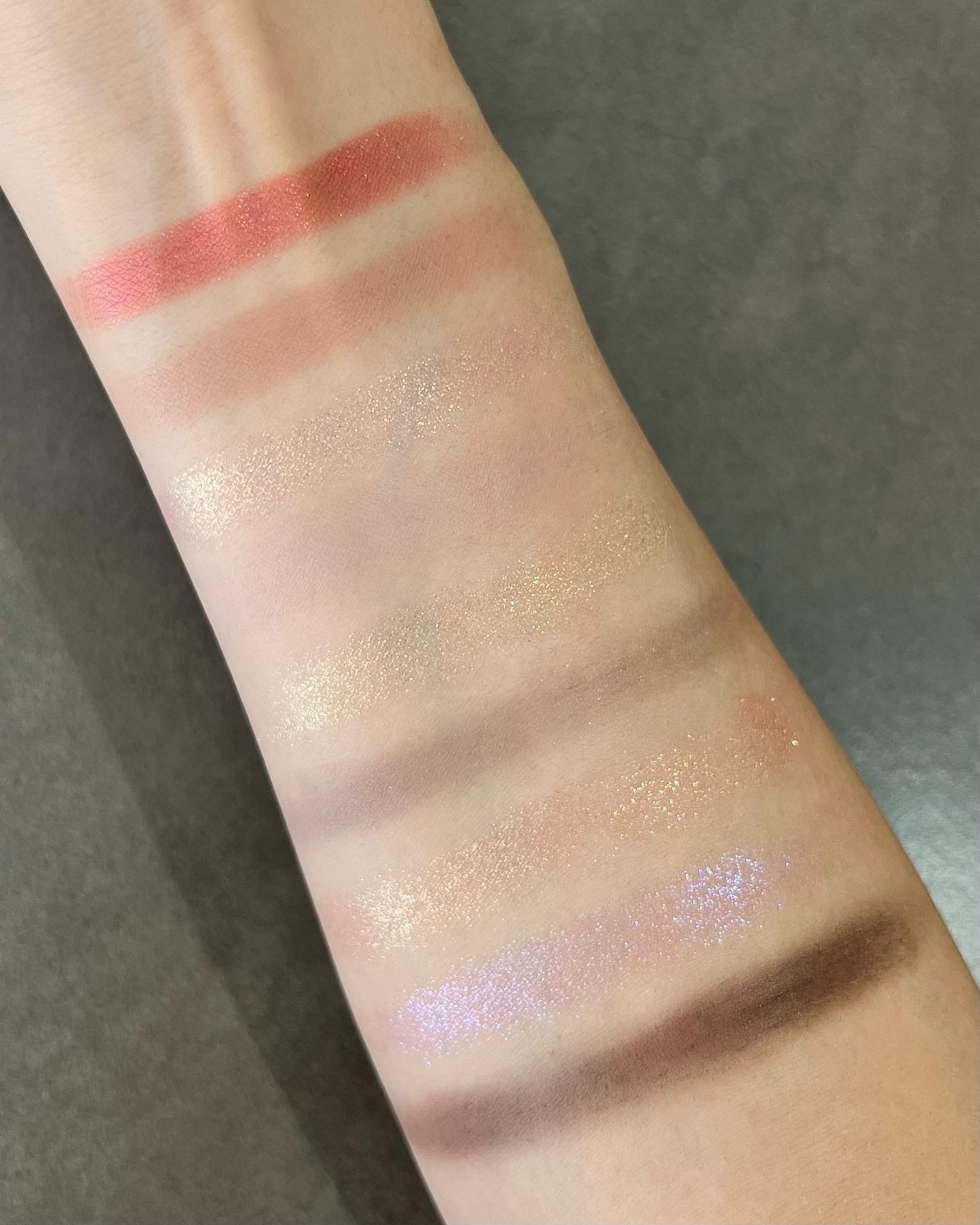 右上のピンクラメをベースに仕込んでメイクしたんだけどツヤと煌めき感えぐすぎる😳💎可愛い、、 そこに右下のカラーを重ねるとじんわり血色感が滲み出るような目元になるよ🦩 これは欠品店舗続出しそう🫣