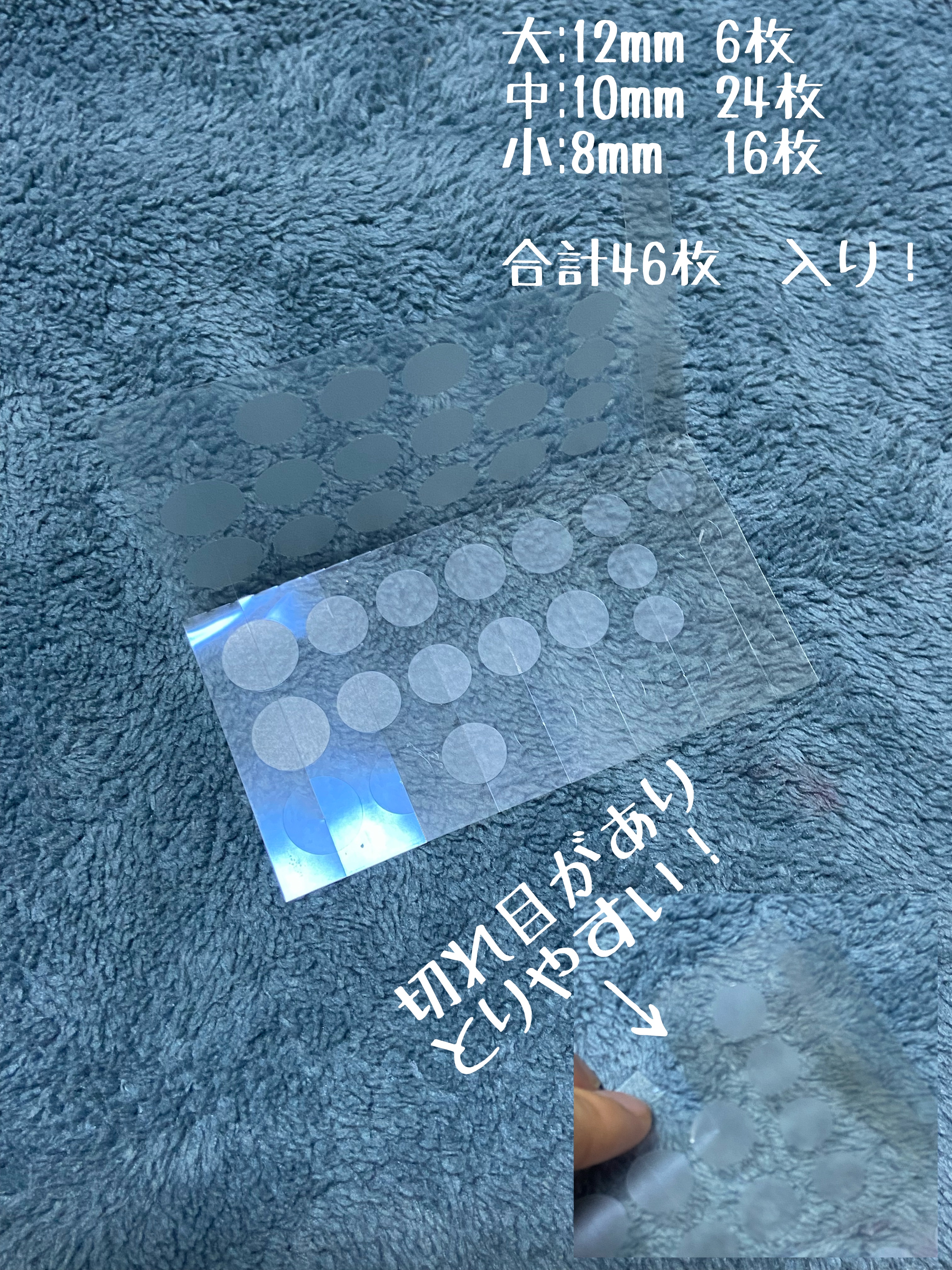 マジで目立ちにくい!! →貼ってるの忘れるくらい目立たない! 透明、高密着で目立ちにくい!! →自然だからめっちゃ馴染む、違和感なし サイズが3種類あるから大きさに合わせて使い分けができるよ!