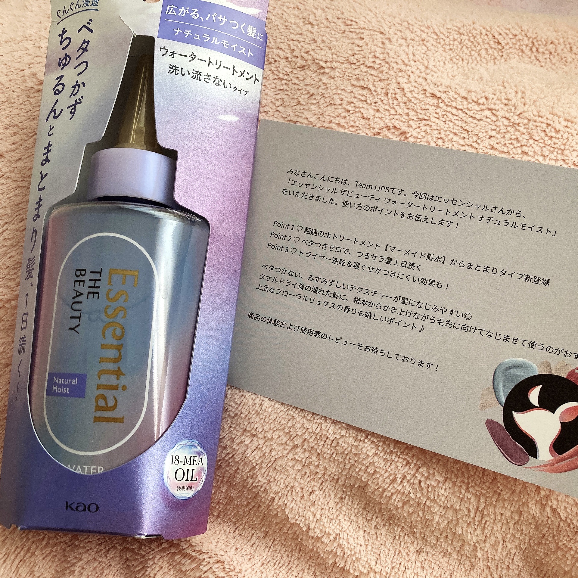 エッセンシャル髪のキメ美容ウォータートリートメントは、初めて使うタイプの洗い流さないトリートメントです💇♀️ バシャバシャと化粧水みたいに使うのが新鮮でしたが、髪の毛一本一本に使えている感じがあり、とてもサラサラになりました! パッケージもとても可愛く、リピしたいです💕
