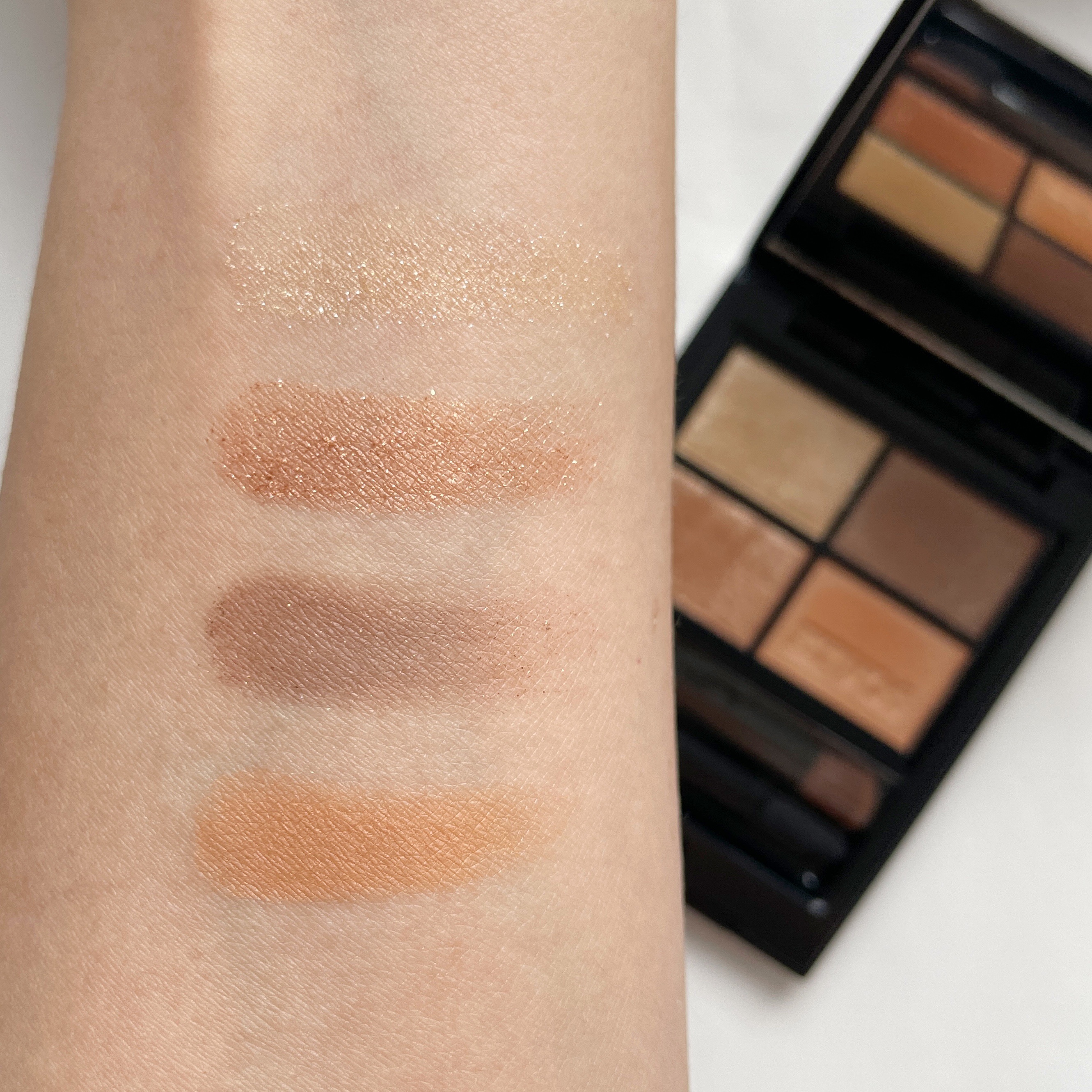 テクスチャーはクリームアイシャドウなので体温でジュワッと溶ける感じなのですが他社のクリームアイシャドウよりも柔らかめだなと感じました。 手で取ると少量でもすごく綺麗なラメ感が出るのでとにかくめちゃくちゃ可愛いです。 お肌に乗せた時の色と仕上がりにめちゃくちゃテンションが上がりました!ほんっっとに可愛いオレンジブラウン! 薄くのばして重ねてもあまりムラが気にならないのでパパッとメイクするときにも使えるしこれ単色でもすごく可愛い。 クリームアイシャドウの中ではまぶたの溝に溜まる量も少なめに感じました。もちろんほんのり溜まっちゃうんですがカラーのおかげもありあまり気にならないかな?という感じ。 カラーの可愛さに本当にびっくりしました。そしてクリームアイシャドウとしてもしっとり感と密着感のバランスが程よくてすごく使いやすく感じています。