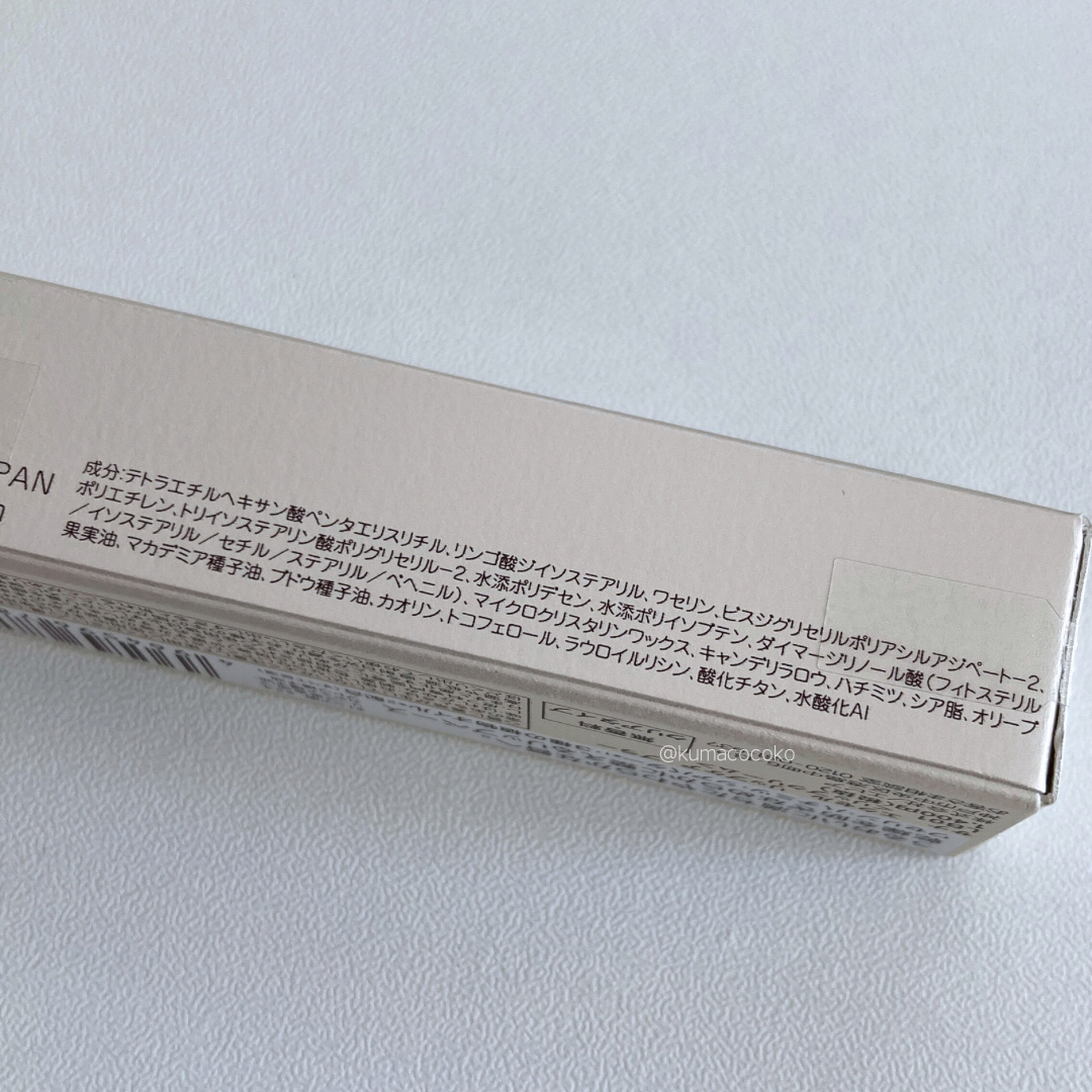 - <LB01 クリアタイプ> テトラエチルヘキサン酸ペンタエリスリチル、リンゴ酸ジイソステアリル、ワセリン、ビスジグリセリルポリアシルアジペート-2、ポリエチレン、トリイソステアリン酸ポリグリセリル-2、水添ポリデセン、水添ポリイソブテン、ダイマージリノール酸(フィトステリル/イソステアリル/セチル/ステアリル/ベヘニル)、マイクロクリスタリンワックス、キャンデリラロウ、ハチミツ、シア脂、オリーブ果実油、マカデミア種子油、ブドウ種子油、カオリン、トコフェロール、ラウロイルリシン、酸化チタン、水酸化Al <LB02 パールホリック(限定カラー)> テトラエチルヘキサン酸ペンタエリスリチル、リンゴ酸ジイソステアリル、ワセリン、ビスジグリセリルポリアシルアジペート-2、ポリエチレン、トリイソステアリン酸ポリグリセリル-2、水添ポリデセン、水添ポリイソブテン、ダイマージリノール酸(フィトステリル/イソステアリル/セチル/ステアリル/ベヘニル)、マイクロクリスタリンワックス、キャンデリラロウ、ハチミツ、シア脂、オリーブ果実油、マカデミア種子油、ブドウ種子油、カオリン、トコフェロール、マイカ、酸化チタン