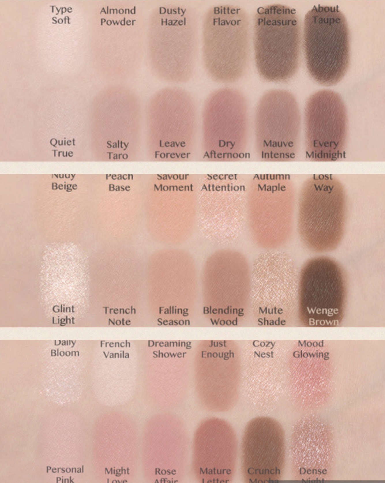 - 軽やかテクスチャーが目元に密着し、抜け感のある色使いが楽しめるデイリーパレット <101 ローズダイアリー(ROSE DIARY)> オーナメントを飾り付けたローズツリーのようにほのかに輝くウォームローズピンクカラー(イエベ秋)。 <102 ミュートアーカイブ(MUTE ARCHIVE)> 少女たちのピンキーなホームパーティームードを盛り込んだクールでヌーディーなミューテッドモブカラー(ブルべ夏ミュート)。 <103 バニラヘイズ(VANILLA HAZE)> 焼きたてのジンジャークッキーのように暖かく香ばしいウォームミュートカラー(イエベ秋ミュート)。 <104 GHR ピンク(GYEONGHOERU FLOWER FESTIVAL)> 春の日の美しく優雅な色を詰め込んだピンクカラーパレット。イエベ春&ブルベ夏におすすめのパレットです。 <105 DSG バイオレット(DEOKSUGUNG STONE WALL ROAD)> ほんのりピンクがかった柔らかなモーブカラーパレット。ブルベ夏&ブルベ冬におすすめのパレットです。 <106 DBG コーラル(GYEONGBOKGUNG STROLL)> 明るい日差しの色を取り入れたデイリーなコーラルカラー。イエベ春&ブライト秋におすすめのパレットです。