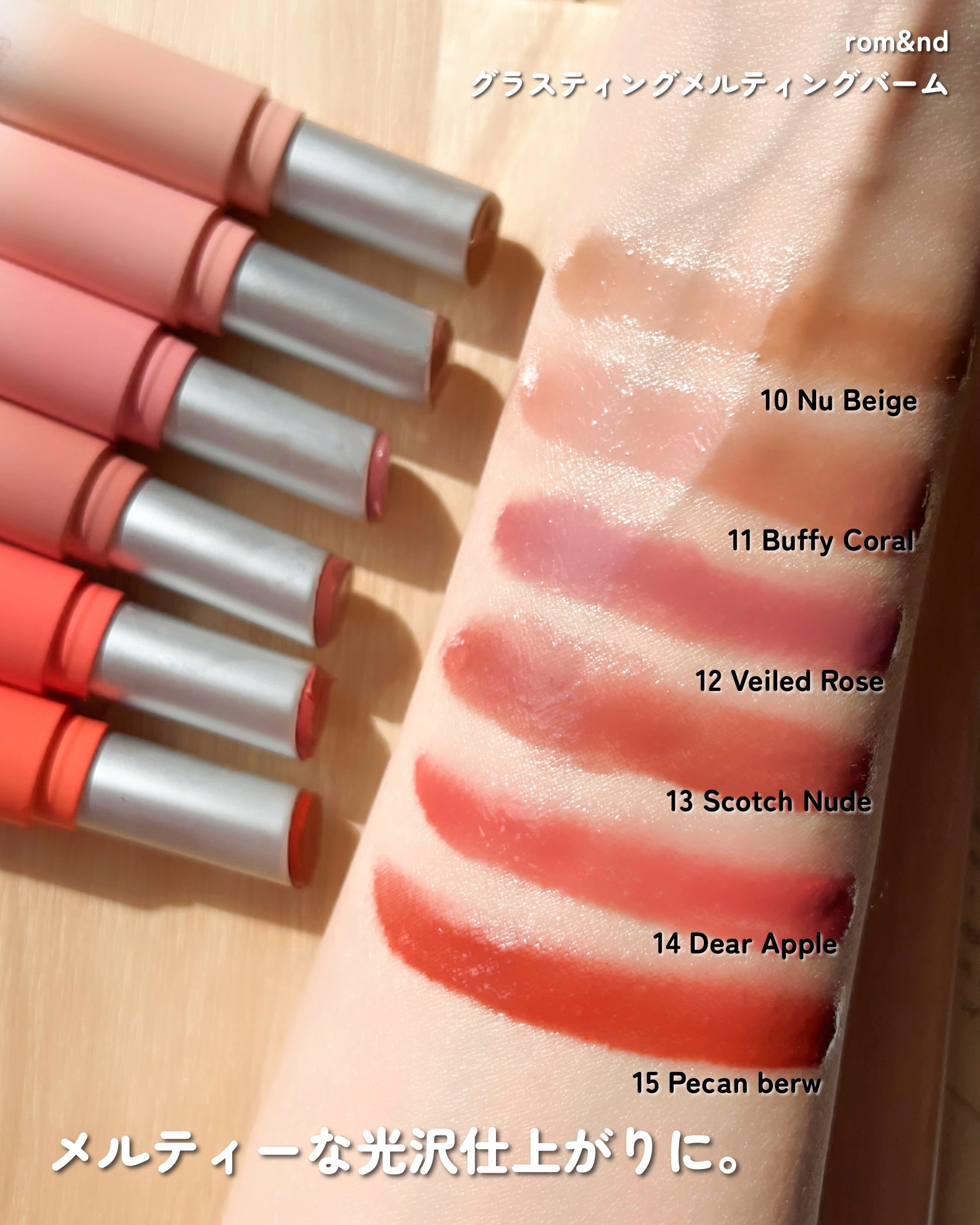 リップオタクの手持ちリップ記録💄rom&ndグラスティングメルティングバーム01COCONUDE06KAYAFIG11BUFFYCORAL12VEILEDROSE15PECANBREW艶感、発色、サイズ感、全てが最高なリップです。落ち着いた色...