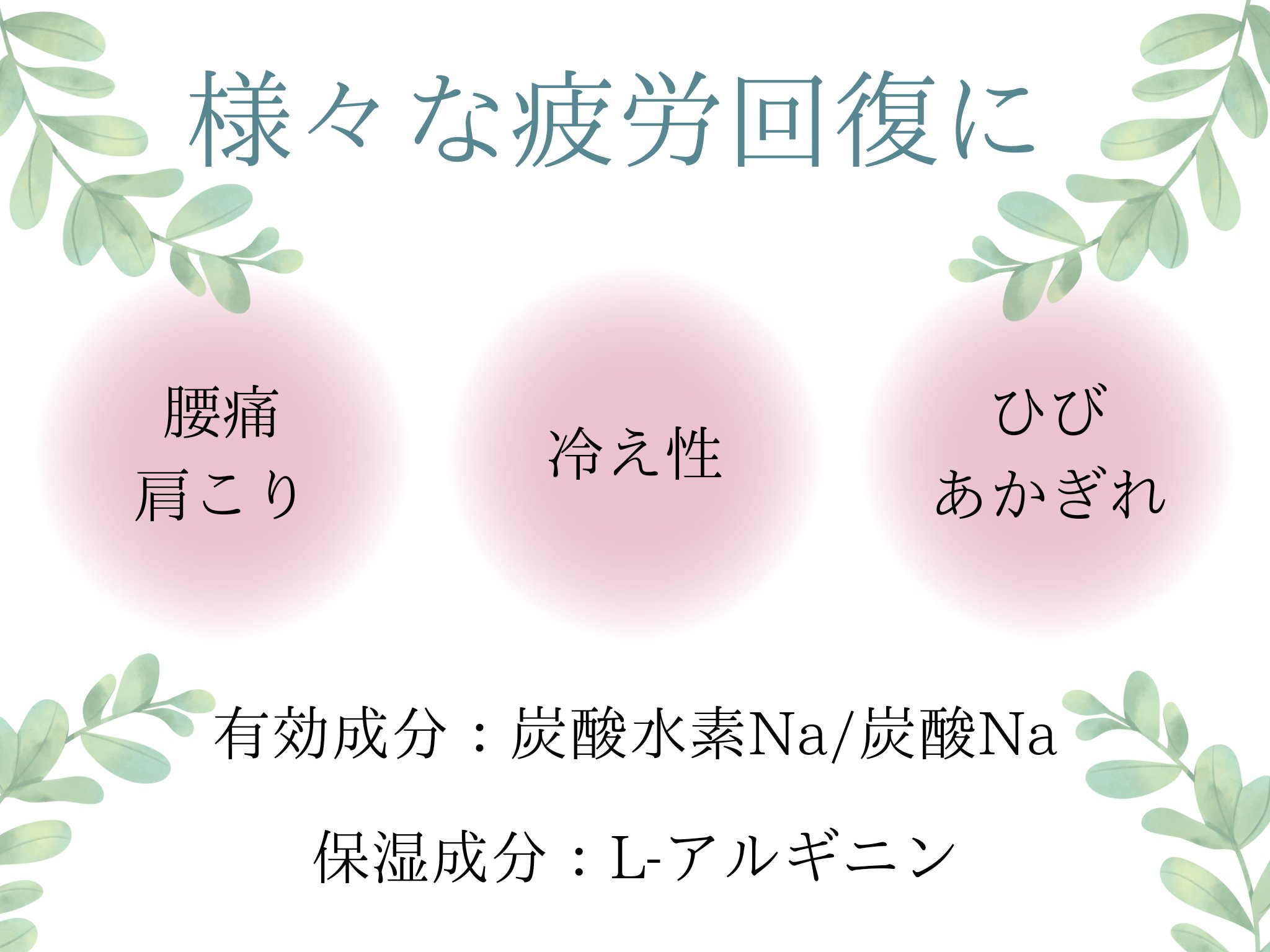 - 【医薬部外品】 1.重炭酸イオンが水中に溶けて、じっくりあたたか(*1)。重炭酸イオンが水中に溶け込み、長くとどまるので、重炭酸入浴と温浴効果を長く楽しめる。 2.有効成分(*2)が温浴効果を高め疲労回復、血行促進をサポート。疲労、腰痛・肩こりなど日々の悩みも。 3.無着色・無香料。重炭酸イオンによる中性のやわらかいお湯質だから、洗髪・洗顔にもおすすめ。 4.保湿成分L-アルギニン配合。バスタイム後もつづく、うるおい気分。 *1) 温浴効果によるもの *2)炭酸Na, 炭酸水素Na