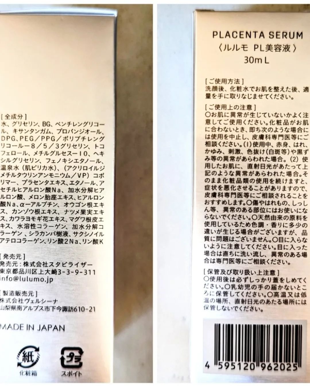 - 水、ヒアルロン酸Na、加水分解ヒアルロン酸、アセチルヒアルロン酸Na、カルボキシメチルヒアルロン酸Na、フェノキシエタノール水、グリセリン、BG、ペンチレングリコール、キサンタンガム、 プロパンジオール、DPG、PEG/PPG/ポリブチレングリコールー8/5/3グリセリン、 トコフェロール、メチルグルセスー10、ヘキシルグリセリン、フェノキシエタノール、 温泉水(肌ピリカ水)、(アクリロイルジメチルタウリンアンモニウム/VP)コポリマー、 プラセンタエキス、エタノール、アセチルヒアルロン酸Na、加水分解ヒアルロン酸、 メロン胎座エキス、ヒアルロン酸Na、αーアルブチン、オウゴン根エキス、カンゾウ根エキス、 ナツメ果実エキス、カワラヨモギ花エキス、マグワ根皮エキス、水溶性コラーゲン、加水分解コラーゲン 、シラカンバ樹液、サクシノイルアテロコラーゲン、リン酸2Na、リン酸K