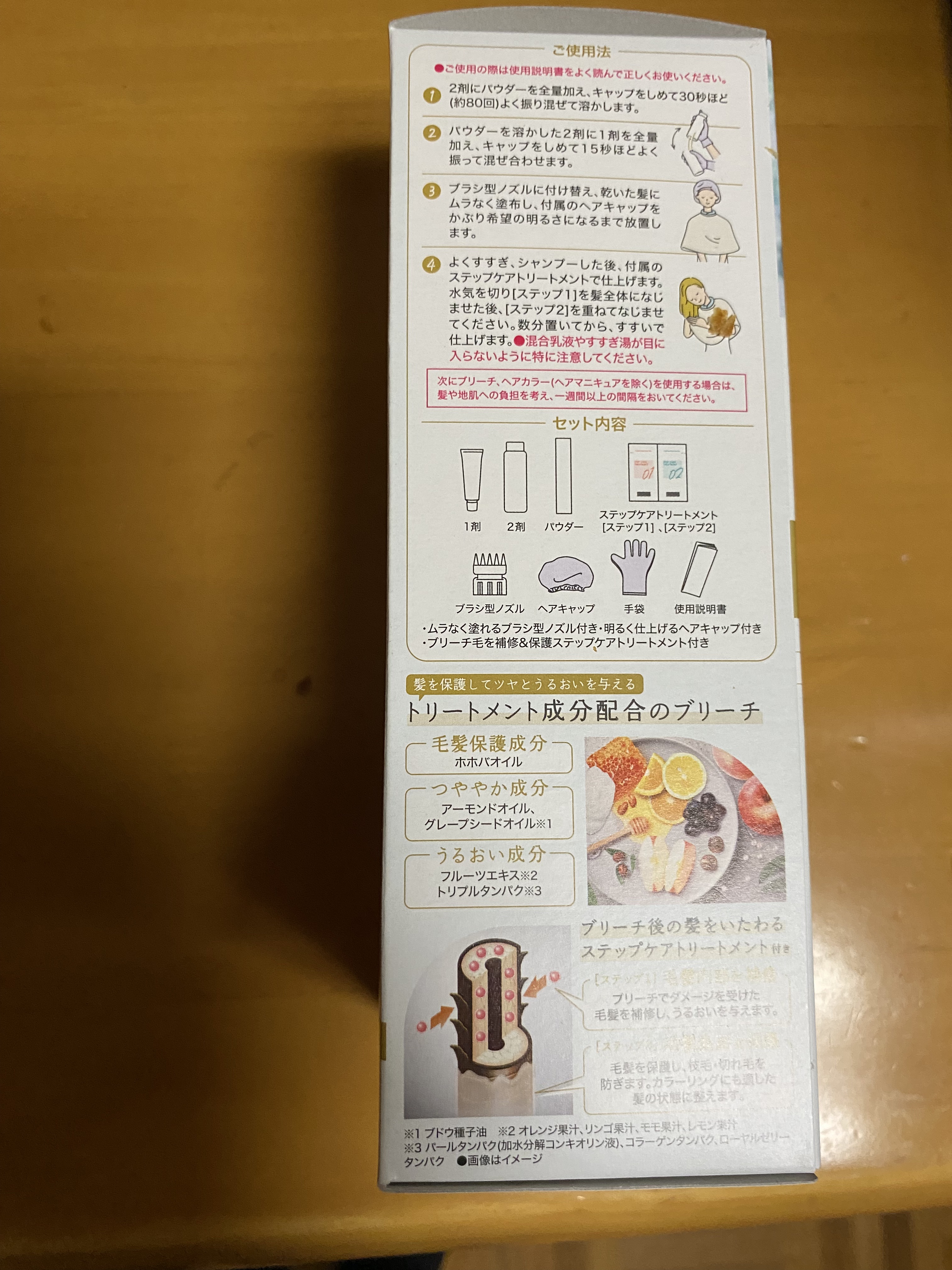 - 【1剤】 [有効成分]:塩酸2,4-ジアミノフェノキシエタノール、トルエン-2,5-ジアミン、5-アミノオルトクレゾール [その他の成分]:亜硫酸ナトリウム、アルモンド油、エタノール、エデト酸四ナトリウム四水塩、塩化アルキルトリメチルアンモニウム、オレンジ果汁、加水分解シルク液、強アンモニア水、ステアリルアルコール、精製水、セタノール、濃グリセリン、ブドウ種子油、ポリ塩化ジメチルジメチレンピロリジニウム液、ポリオキシエチレンセチルエーテル、メチルポリシロキサン、モノエタノールアミン、モモ果汁、流動パラフィン、リンゴ果汁、レゾルシン、レモン果汁、L-アスコルビン酸、香料 【2剤】 [有効成分]:過酸化水素 [その他の成分]:ジエチレングリコールモノエチルエーテル、精製水、セタノール、セチル硫酸ナトリウム、ヒドロキシエタンジホスホン酸液、フェノキシエタノール、プロピレングリコール、リン酸、リン酸水素二ナトリウム