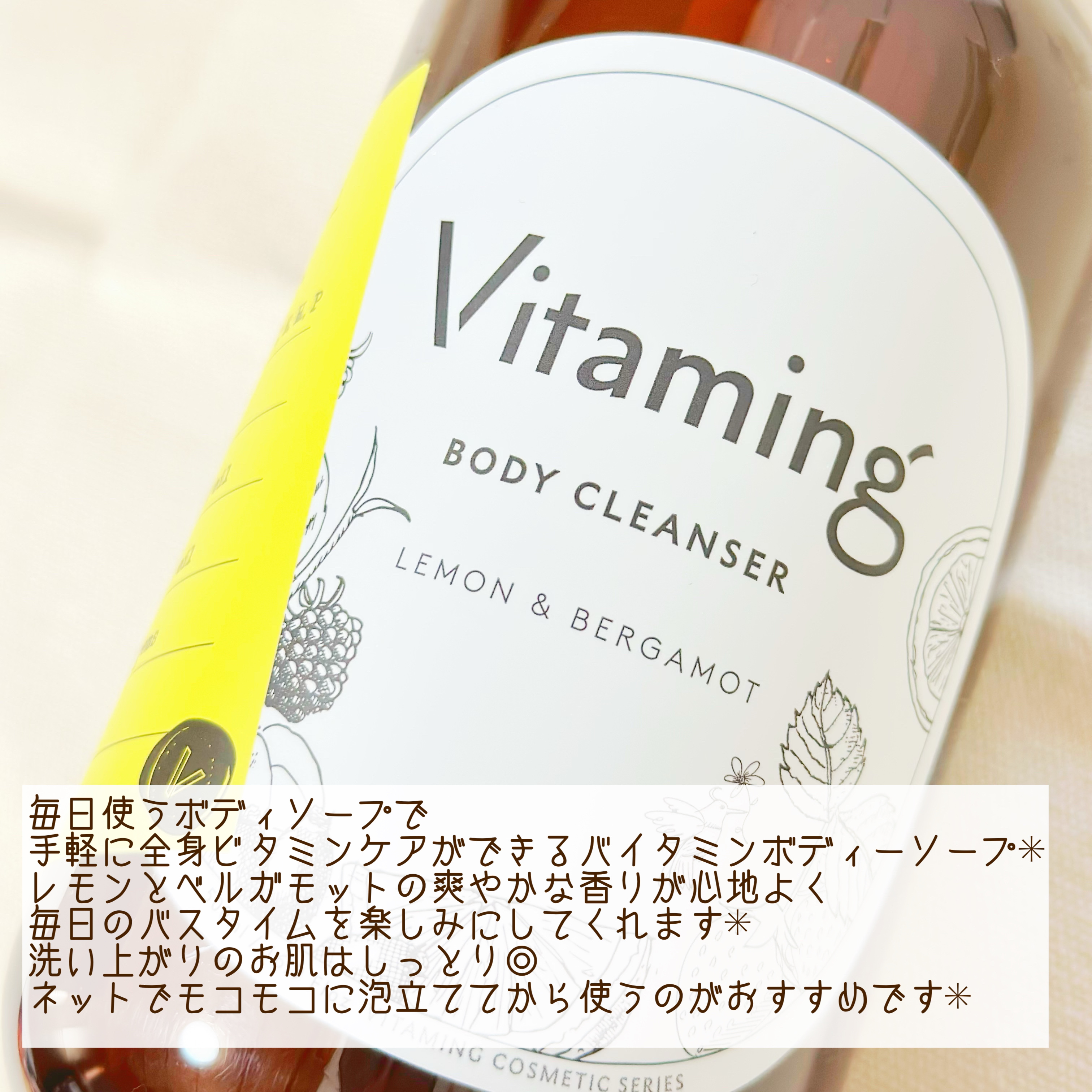 全身をビタミンで流す🍋 洗いながらエイジングケア*ができるボディソープ🫧 ビタミンにフォーカスしたブランド「バイタミング」 7種のビタミン成分 A、B、E、H、P、2種のビタミンCを配合。 洗い上がりはしっとりさもありさっぱりさもあり… とにかくいい感じなんです(伝わらない)