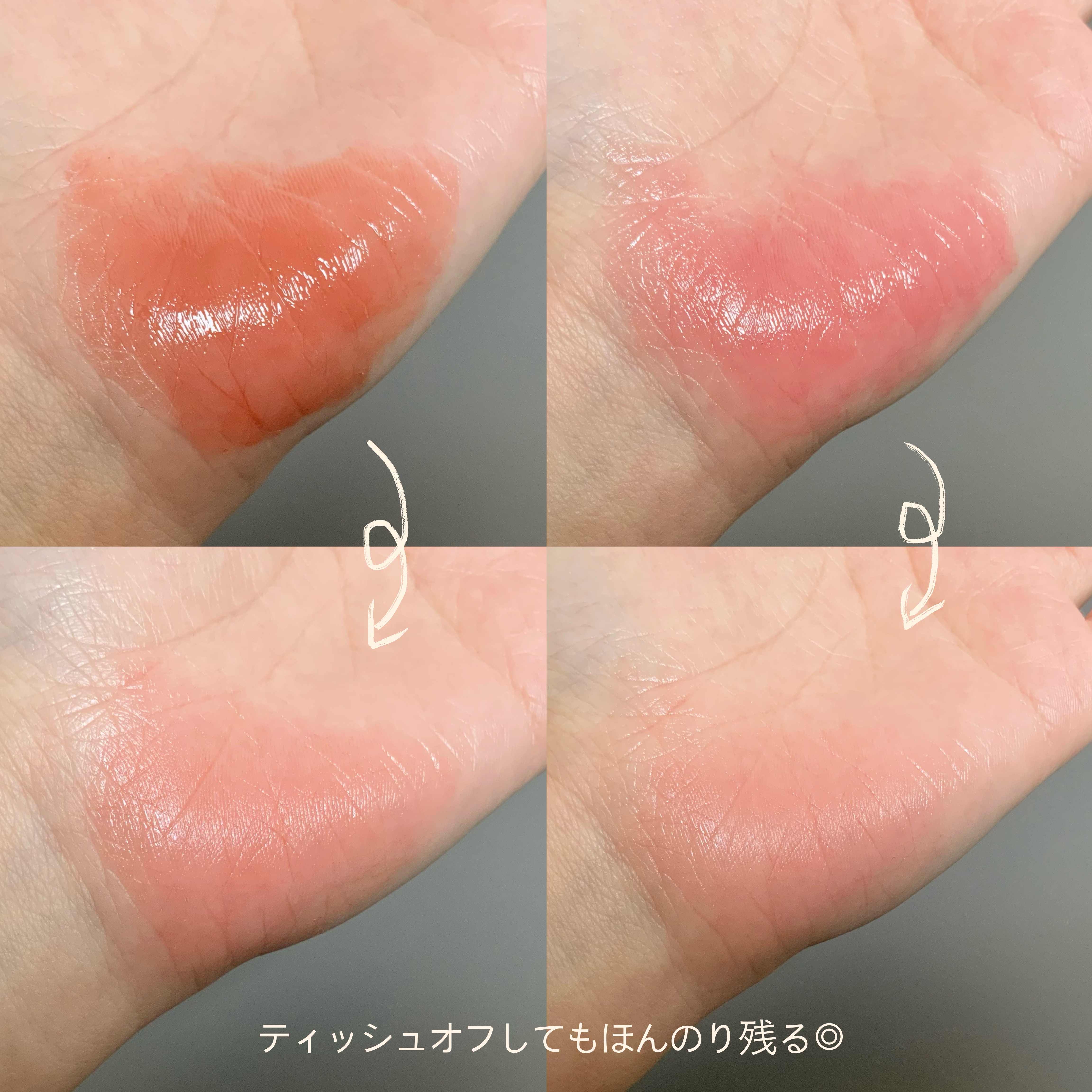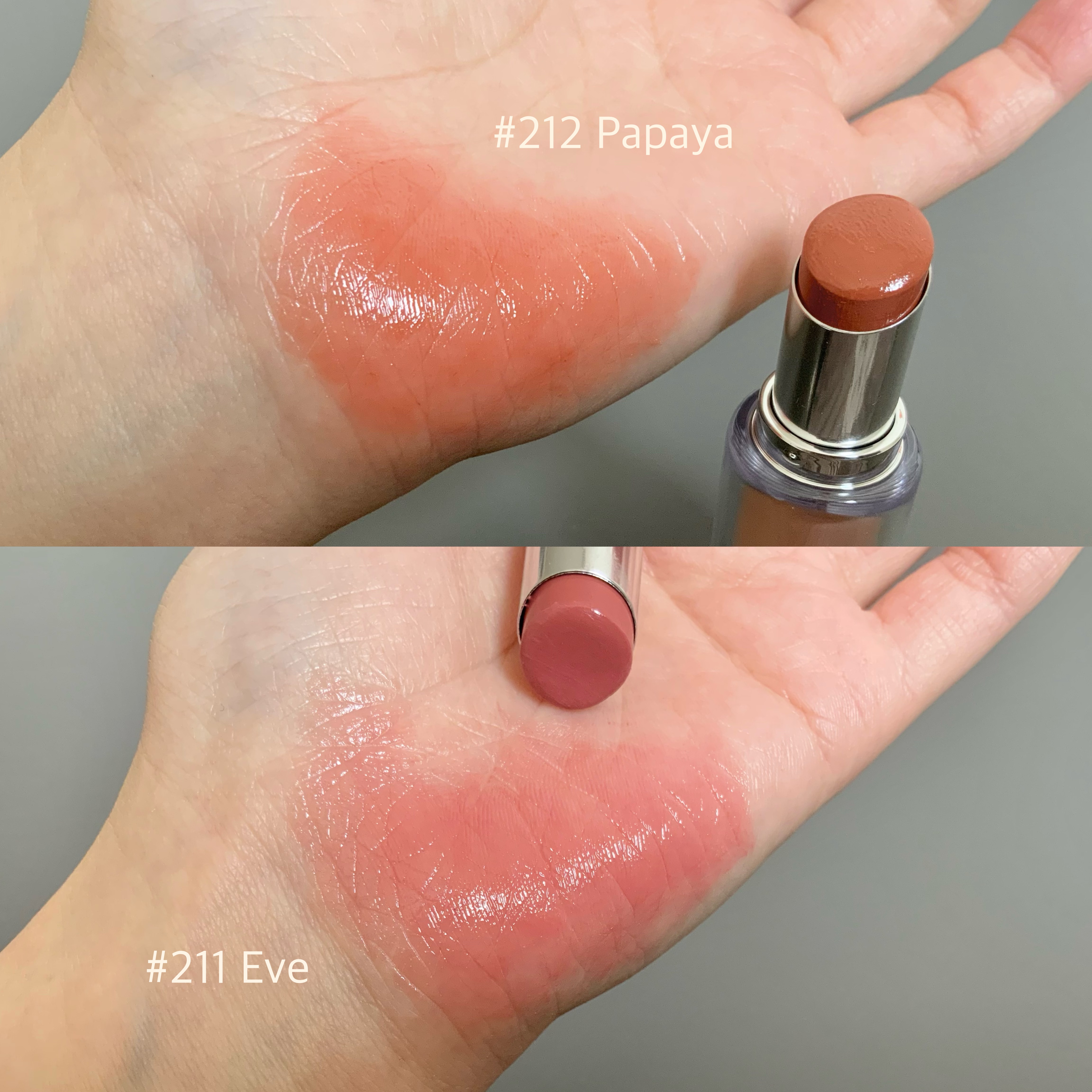 なんとも可愛らしい想像していたよりくすみのないお色でした! 真ん中らへんの色というのはまさしくそうだなと思います。 211イヴはピンクの真ん中の色という感じ。 212パパイアはオレンジの真ん中の色。 薄く塗ってみるととってもナチュラルに色付きツヤっと見せてくれて、 塗り重ねていくとムチッと密着して ガラス玉のようなツヤツヤな唇になります。 香りは南国フルーツのような香りがします。 パパイアが本当に美味しそうな色なのと 南国フルーツの香りもするのも相まってここは南国…?という気分になります。