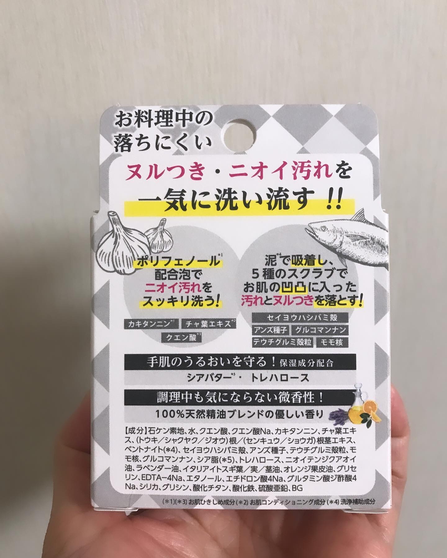 ポリフェノール泡でニオイのもとを徹底洗浄し、トリメチルアミンやアリシンなどの臭いのもとをポリフェノールがしっかり洗い流してくれるんだとか(*1) 更には汚れを吸着する泥と、お肌の凹凸に入った汚れやヌルつきを5種のスクラブがすっきり落としてくれるそう(*2) (*3)❤️ それにしっとり感が続く✨シアバターとトレハロース✨も配合してるので手がガサガサになりづらいし(*4) 天然精油100%🌿で、ほのかなナチュラルハーブの香りが料理の匂いも邪魔しないしで使い心地がよかったですっ❤️