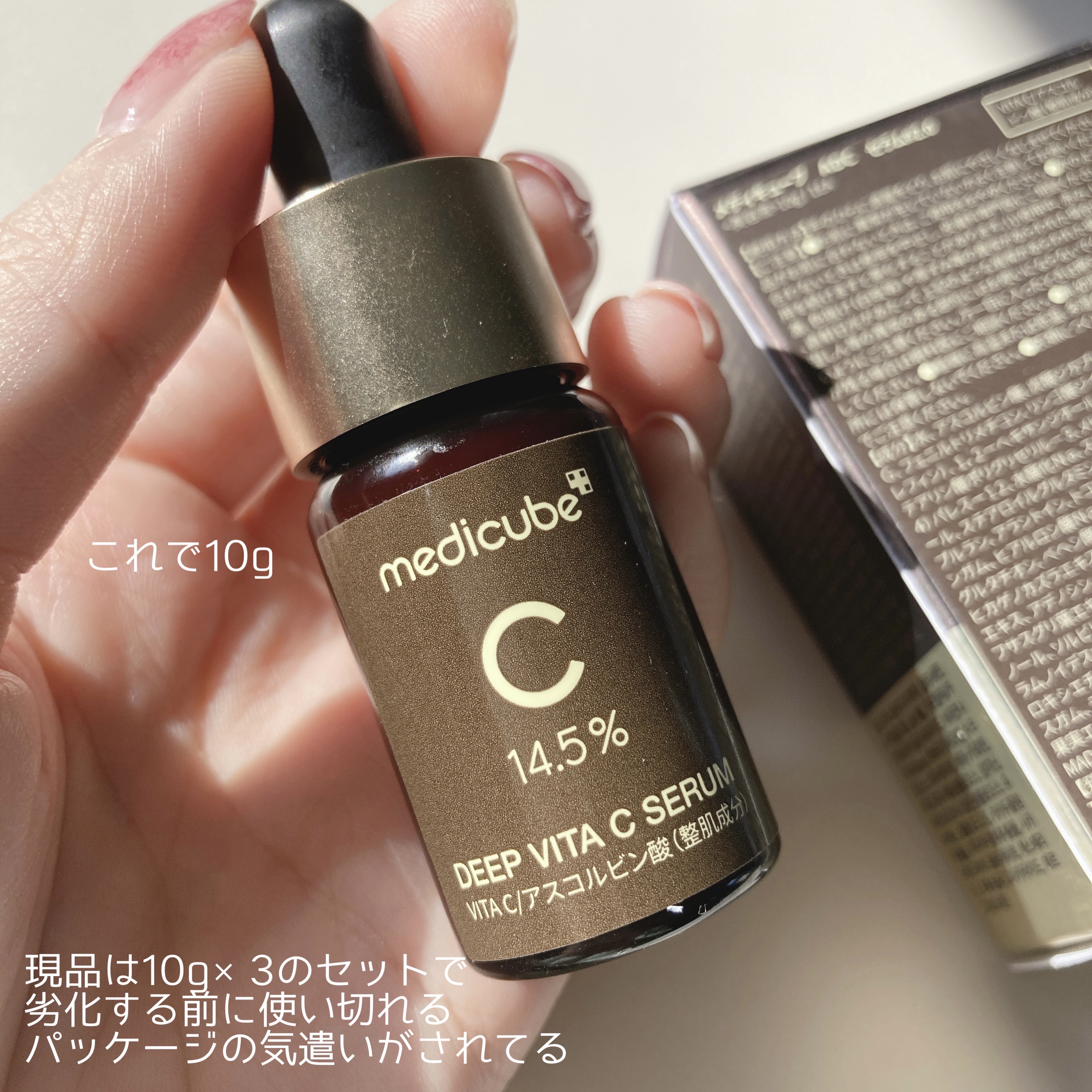 シミ・美白ケアビタミンC美容液 茶色の3つの瓶に小分け 光や熱に弱く酸化したり、色が変質するなど安定化が難しいビタミンC 新鮮なビタミンC成分をお肌に届けることができます。 目に見える表面のしみから、まだ表面に出てきていない内側のしみまで改善。 濃密ですがすっと肌になじんでさらっとした感じ。 1週間使用してみて効果を感じてきたので、継続して使っていくのが楽しみ✨