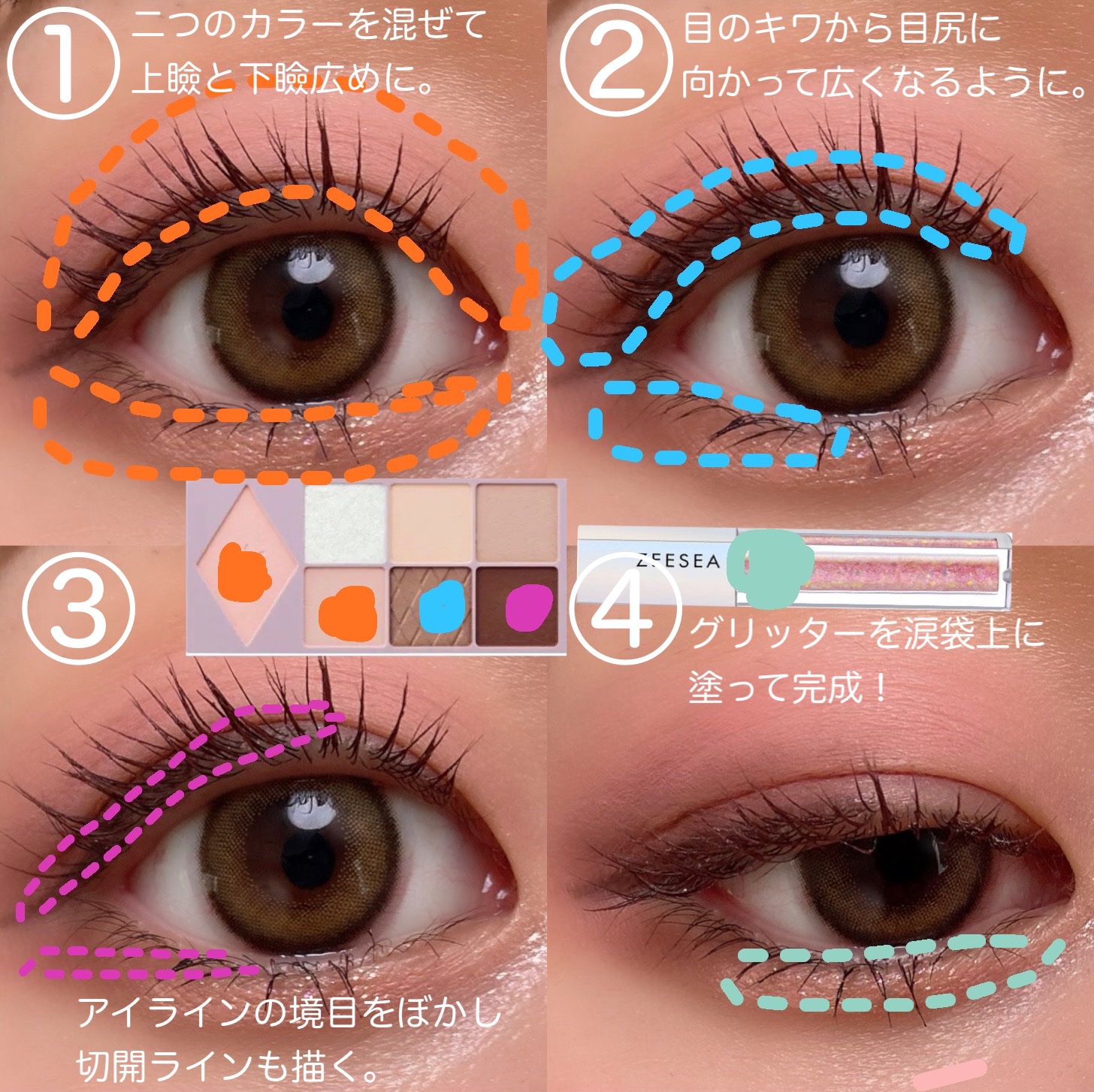 アンドバイロムアンドグラッシーアイグリッター PK01チェリーブロッサム、OR01オレンジブロッサム PK01チェリーブロッサムはピンクや紫、青ラメがたくさん入ったグリッター✨ 桜のようなピンクカラーで目元に甘さをプラスしてくれます🤍 OR01オレンジブロッサムはゴールドやピンク、キラッキラのホログラムが入っているグリッター✨ ゴールドラメが中心にたくさん入っているので、肌馴染みも◎ どちらもパリッとした仕上がりになりにくくて、とっても綺麗な仕上がりに感動しました🥺! 最初はPK01チェリーブロッサムだけ購入したんですが、使ってみるとあまりにも可愛くてすぐにOR01オレンジブロッサムも追加で購入したくらいお気に入りのグリッターです🩷笑 LAWSONで購入することができるとっても可愛いプチプラグリッター、是非ゲットしてみてください🎀