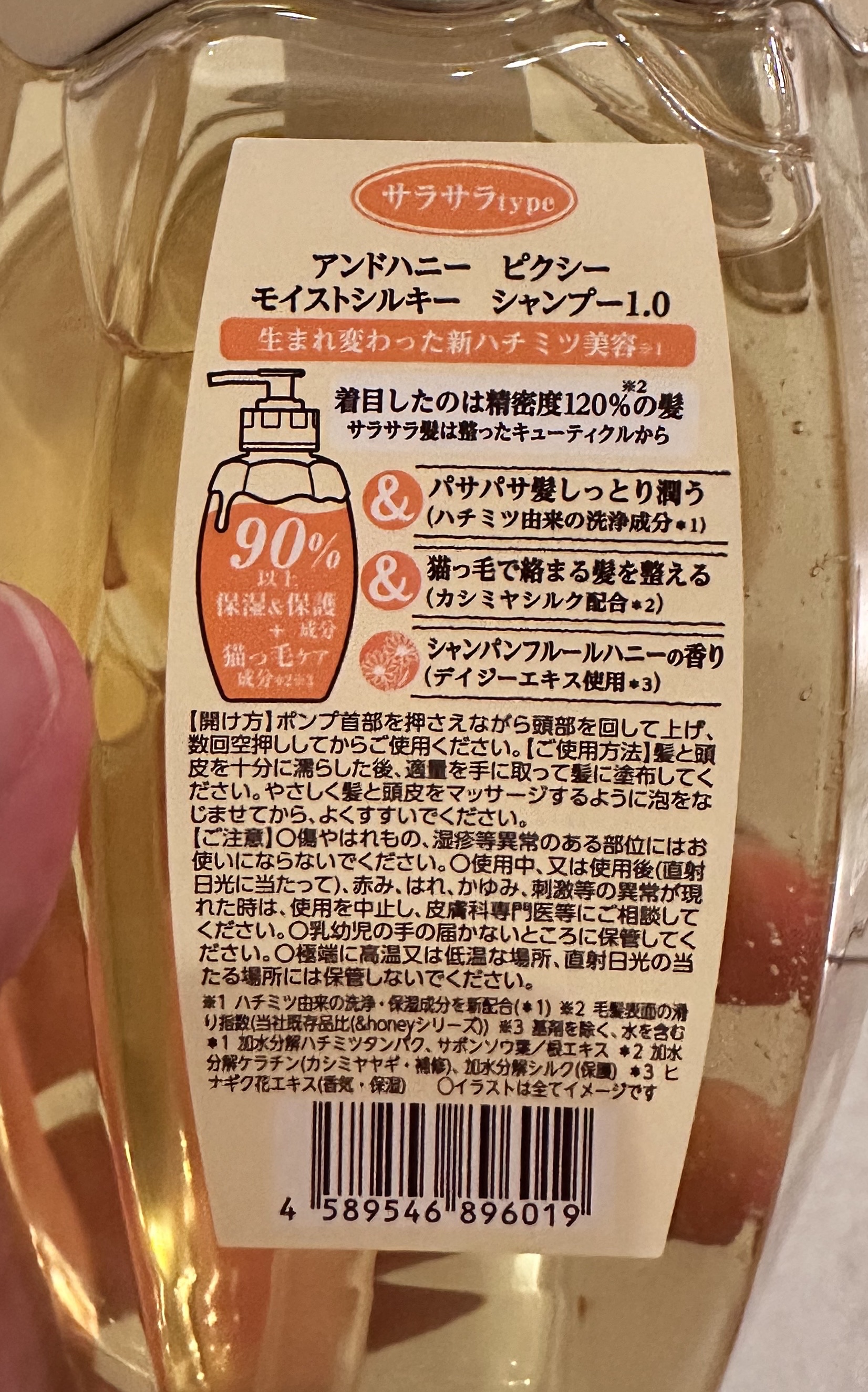 - <シャンプー本体 440ml> 水、ラウラミドプロピルベタイン、オレフィン(C14-16)スルホン酸Na、ココイルメチルタウリンNa、コカミドDEA、ハチミツ、ハチミツエキス、加水分解ハチミツタンパク、プロポリスエキス、ローヤルゼリーエキス、アルガニアスピノサ核油、加水分解ケラチン(カシミヤヤギ)(羊毛)、加水分解シルク、シア脂、セレブロシド、ヒアルロン酸クロスポリマーNa、ゼイン、ヒナギク花エキス、サボンソウ葉/根エキス、ヤシ油脂肪酸PEG-7グリセリル、EDTA-2Na、ポリクオタニウム-10、ヤシ油アルキルグルコシド、ステアリン酸エチルヘキシル、キサンタンガム、イソステアリン酸Na、(ジイソステアリン酸/ポリヒドロキシステアリン酸/セバシン酸)ポリグリセリル-4、グリセリン、安息香酸Na、クエン酸、黄4、黄5、DPG、BG、フェノキシエタノール、香料 <ヘアトリートメント本体 440g> 水、DPG、セテアリルアルコール、ベヘントリモニウムクロリド、ハチミツ、ハチミツエキス、加水分解ハチミツタンパク、プロポリスエキス、ローヤルゼリーエキス、アルガニアスピノサ核油、加水分解ケラチン(カシミヤヤギ)(羊毛)、加水分解シルク、シア脂、セレブロシド、ヒアルロン酸クロスポリマーNa、ゼイン、ソケイ花エキス、サボンソウ葉/根エキス、ヤシ油アルキルグルコシド、ステアリン酸エチルヘキシル、キサンタンガム、ジメチコン、イソプロパノール、(ジイソステアリン酸/ポリヒドロキシステアリン酸/セバシン酸)ポリグリセリル-4、グリセリン、ペンテト酸5Na、クエン酸、クエン酸Na、黄4、黄5、イソステアリン酸Na、BG、フェノキシエタノール、香料 <シャンプー(つめかえ) 350ml> 水、ラウラミドプロピルベタイン、オレフィン(C14-16)スルホン酸Na、ココイルメチルタウリンNa、コカミドDEA、ハチミツ、ハチミツエキス、加水分解ハチミツタンパク、プロポリスエキス、ローヤルゼリーエキス、アルガニアスピノサ核油、加水分解ケラチン(カシミヤヤギ)(羊毛)、加水分解シルク、シア脂、セレブロシド、ヒアルロン酸クロスポリマーNa、ゼイン、ヒナギク花エキス、サボンソウ葉/根エキス、ヤシ油脂肪酸PEG-7グリセリル、EDTA-2Na、ポリクオタニウム-10、ヤシ油アルキルグルコシド、ステアリン酸エチルヘキシル、キサンタンガム、イソステアリン酸Na、(ジイソステアリン酸/ポリヒドロキシステアリン酸/セバシン酸)ポリグリセリル-4、グリセリン、安息香酸Na、クエン酸、黄4、黄5、DPG、BG、フェノキシエタノール、香料 <ヘアトリートメント(つめかえ) 350g> 水、DPG、セテアリルアルコール、ベヘントリモニウムクロリド、ハチミツ、ハチミツエキス、加水分解ハチミツタンパク、プロポリスエキス、ローヤルゼリーエキス、アルガニアスピノサ核油、加水分解ケラチン(カシミヤヤギ)(羊毛)、加水分解シルク、シア脂、セレブロシド、ヒアルロン酸クロスポリマーNa、ゼイン、ソケイ花エキス、サボンソウ葉/根エキス、ヤシ油アルキルグルコシド、ステアリン酸エチルヘキシル、キサンタンガム、ジメチコン、イソプロパノール、(ジイソステアリン酸/ポリヒドロキシステアリン酸/セバシン酸)ポリグリセリル-4、グリセリン、ペンテト酸5Na、クエン酸、クエン酸Na、黄4、黄5、イソステアリン酸Na、BG、フェノキシエタノール、香料 <ヘアトリートメント詰替え10%増量 385g> 水、DPG、セテアリルアルコール、ベヘントリモニウムクロリド、ハチミツ、ハチミツエキス、加水分解ハチミツタンパク、プロポリスエキス、ローヤルゼリーエキス、アルガニアスピノサ核油、加水分解ケラチン(カシミヤヤギ)(羊毛)、加水分解シルク、シア脂、セレブロシド、ヒアルロン酸クロスポリマーNa、ゼイン、ソケイ花エキス、サボンソウ葉/根エキス、ヤシ油アルキルグルコシド、ステアリン酸エチルヘキシル、キサンタンガム、ジメチコン、イソプロパノール、(ジイソステアリン酸/ポリヒドロキシステアリン酸/セバシン酸)ポリグリセリル-4、グリセリン、ペンテト酸5Na、クエン酸、クエン酸Na、黄4、黄5、イソステアリン酸Na、BG、フェノキシエタノール、香料 <シャンプー詰替え10%増量 385ml> 水、ラウラミドプロピルベタイン、オレフィン(C14-16)スルホン酸Na、ココイルメチルタウリンNa、コカミドDEA、ハチミツ、ハチミツエキス、加水分解ハチミツタンパク、プロポリスエキス、ローヤルゼリーエキス、アルガニアスピノサ核油、加水分解ケラチン(カシミヤヤギ)(羊毛)、加水分解シルク、シア脂、セレブロシド、ヒアルロン酸クロスポリマーNa、ゼイン、ヒナギク花エキス、サボンソウ葉/根エキス、ヤシ油脂肪酸PEG-7グリセリル、EDTA-2Na、ポリクオタニウム-10、ヤシ油アルキルグルコシド、ステアリン酸エチルヘキシル、キサンタンガム、イソステアリン酸Na、(ジイソステアリン酸/ポリヒドロキシステアリン酸/セバシン酸)ポリグリセリル-4、グリセリン、安息香酸Na、クエン酸、黄4、黄5、DPG、BG、フェノキシエタノール、香料