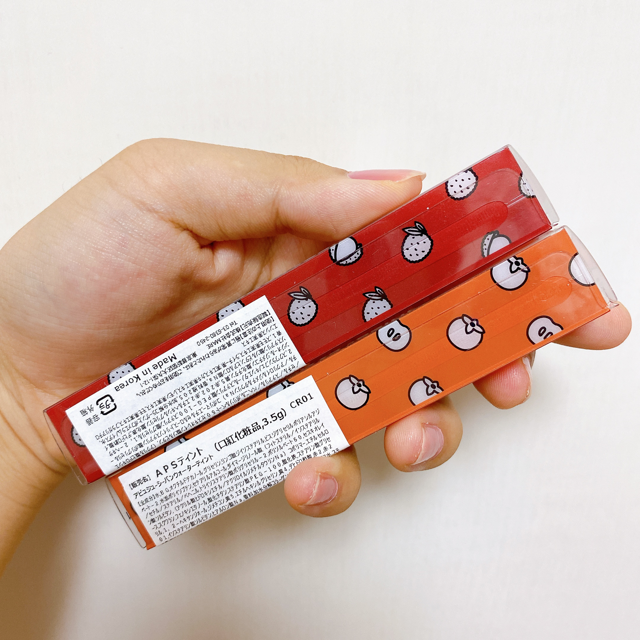 - <BE01 ピーチ> 水、BG、オクチルドデカノール、グリセリン、リンゴ酸ジイソステアリル、ビスジグリセリルポリアシルアジペート-2、水添ポリイソブテン、セテアリルアルコール、ダイマージリノール酸(フィトステリル/イソステアリル/セチル/ステアリル/ベヘニル)、ポリソルベート60、セスキオレイン酸ソルビタン、(アクリル酸ヒドロキシエチル/アクリロイルジメチルタウリンNa)コポリマー、エチルセルロース、トリイソステアリン酸ポリグリセリル-2、スクワラン、酸化チタン、ステアリン酸PEG-100、ステアリン酸グリセリル、1,2-ヘキサンジオール、ジメチコン、エチルヘキシルグリセリン、酸化鉄、イソステアリン酸ソルビタン、ヒアルロン酸Na、加水分解コラーゲン、ヒポファエラムノイデス水、スモモ果実エキス、ライチー果実エキス、カキ果実エキス、レモン果実エキス、モモ果実エキス、フラガリアチロエンシス果実エキス、デヒドロ酢酸、フェノキシエタノール、赤227、黄5、黄4、赤102、青1、香料 <CR01 甘柿> 水、BG、オクチルドデカノール、グリセリン、リンゴ酸ジイソステアリル、ビスジグリセリルポリアシルアジペート-2、水添ポリイソブテン、セテアリルアルコール、ダイマージリノール酸(フィトステリル/イソステアリル/セチル/ステアリル/ベヘニル)、トリイソステアリン酸ポリグリセリル-2、ポリソルベート60、セスキオレイン酸ソルビタン、(アクリル酸ヒドロキシエチル/アクリロイルジメチルタウリンNa)コポリマー、エチルセルロース、スクワラン、酸化チタン、ステアリン酸PEG-100、酸化鉄、ステアリン酸グリセリル、1,2-ヘキサンジオール、ジメチコン、エチルヘキシルグリセリン、イソステアリン酸ソルビタン、ヒアルロン酸Na、加水分解コラーゲン、ヒポファエラムノイデス水、スモモ果実エキス、ライチー果実エキス、カキ果実エキス、レモン果実エキス、モモ果実エキス、フラガリアチロエンシス果実エキス、デヒドロ酢酸、フェノキシエタノール、黄5、黄4、赤2、赤201、青1、香料 <CR02 ライチ> 水、BG、オクチルドデカノール、グリセリン、リンゴ酸ジイソステアリル、ビスジグリセリルポリアシルアジペート-2、水添ポリイソブテン、セテアリルアルコール、ダイマージリノール酸(フィトステリル/イソステアリル/セチル/ステアリル/ベヘニル)、ポリソルベート60、セスキオレイン酸ソルビタン、(アクリル酸ヒドロキシエチル/アクリロイルジメチルタウリンNa)コポリマー、エチルセルロース、トリイソステアリン酸ポリグリセリル-2、スクワラン、ステアリン酸PEG-100、ステアリン酸グリセリル、1,2-ヘキサンジオール、ジメチコン、酸化チタン、エチルヘキシルグリセリン、酸化鉄、イソステアリン酸ソルビタン、ヒアルロン酸Na、加水分解コラーゲン、ヒポファエラムノイデス水、スモモ果実エキス、ライチー果実エキス、カキ果実エキス、レモン果実エキス、モモ果実エキス、フラガリアチロエンシス果実エキス、デヒドロ酢酸、フェノキシエタノール、黄5、赤202、赤2、橙205、青1、香料 <RD01 ストロベリー> 水、BG、オクチルドデカノール、グリセリン、リンゴ酸ジイソステアリル、ビスジグリセリルポリアシルアジペート-2、水添ポリイソブテン、セテアリルアルコール、ダイマージリノール酸(フィトステリル/イソステアリル/セチル/ステアリル/ベヘニル)、ポリソルベート60、セスキオレイン酸ソルビタン、(アクリル酸ヒドロキシエチル/アクリロイルジメチルタウリンNa)コポリマー、トリイソステアリン酸ポリグリセリル-2、エチルセルロース、スクワラン、ステアリン酸PEG-100、ステアリン酸グリセリル、1,2-ヘキサンジオール、酸化チタン、ジメチコン、エチルヘキシルグリセリン、イソステアリン酸ソルビタン、ヒアルロン酸Na、酸化鉄、加水分解コラーゲン、ヒポファエラムノイデス水、スモモ果実エキス、ライチー果実エキス、カキ果実エキス、レモン果実エキス、モモ果実エキス、フラガリアチロエンシス果実エキス、デヒドロ酢酸、フェノキシエタノール、赤202、赤102、赤2、黄4、赤227、青1、香料 <PK01 ピンクレモン> 水、BG、オクチルドデカノール、グリセリン、リンゴ酸ジイソステアリル、ビスジグリセリルポリアシルアジペート-2、水添ポリイソブテン、セテアリルアルコール、ダイマージリノール酸(フィトステリル/イソステアリル/セチル/ステアリル/ベヘニル)、ポリソルベート60、セスキオレイン酸ソルビタン、(アクリル酸ヒドロキシエチル/アクリロイルジメチルタウリンNa)コポリマー、トリイソステアリン酸ポリグリセリル-2、エチルセルロース、酸化チタン、スクワラン、ステアリン酸PEG-100、ステアリン酸グリセリル、1,2-ヘキサンジオール、ジメチコン、エチルヘキシルグリセリン、酸化鉄、イソステアリン酸ソルビタン、ヒアルロン酸Na、加水分解コラーゲン、ヒポファエラムノイデス水、スモモ果実エキス、ライチー果実エキス、カキ果実エキス、レモン果実エキス、モモ