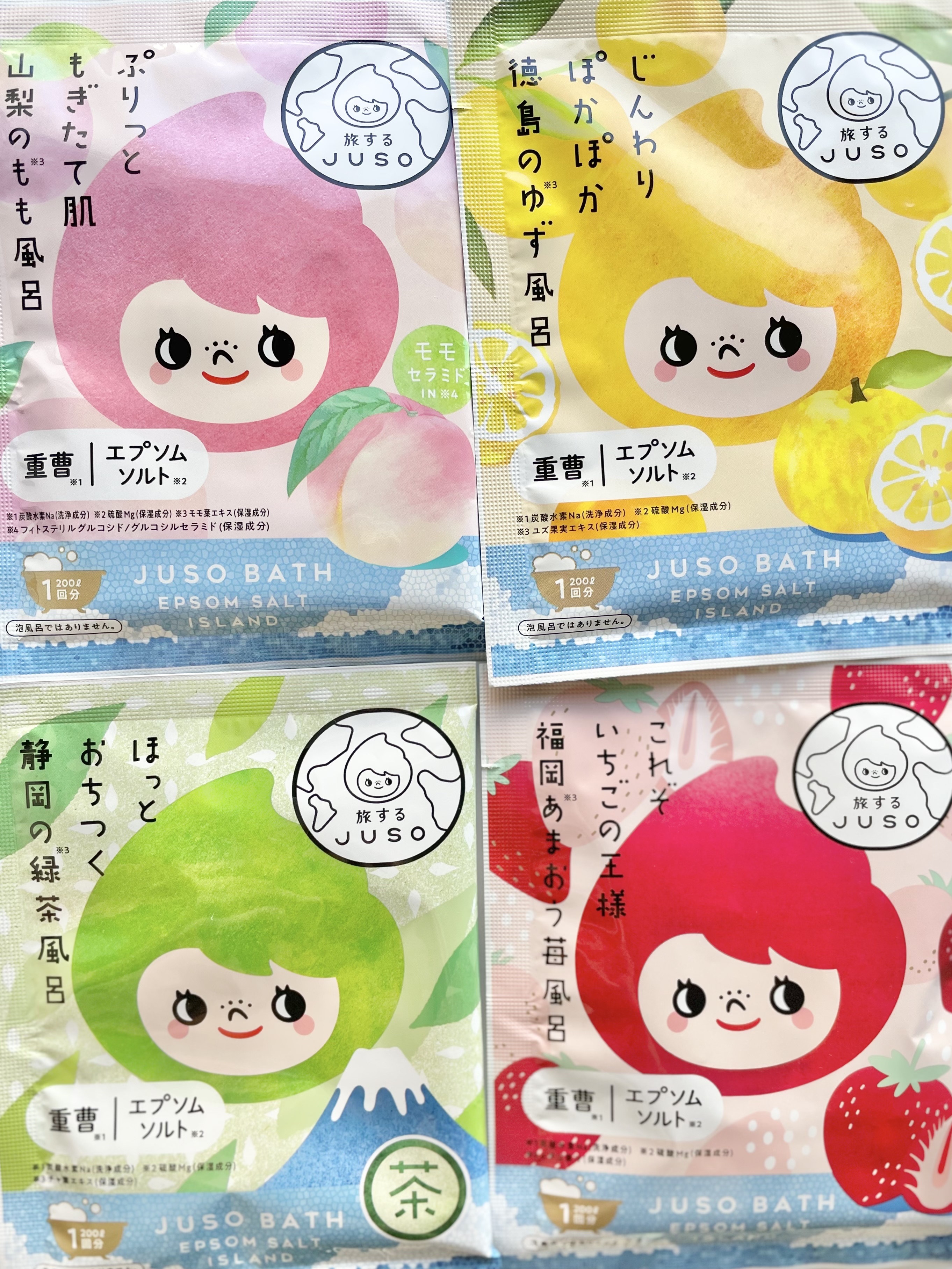 - 旅するJUSOちゃんのご当地入浴剤シリーズ。 重曹(炭酸水素Na:洗浄成分)のお風呂ですべすべお肌に。 エプソムソルト(硫酸Mg:保湿成分) 、有機ゲルマニウム(レパゲルマニウム:保湿成分) 入り 温浴効果によりじんわり汗、体をぽかぽか温める。