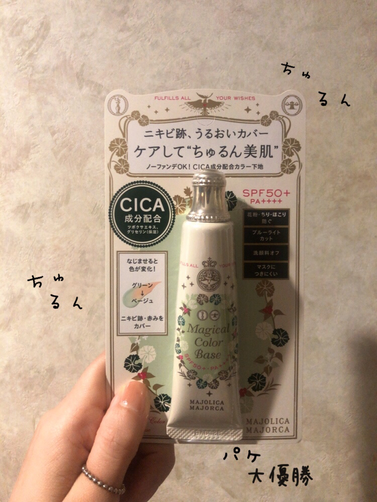 MAJOLICAMAJORCAのマジカルカラーベース🟢✍️グリーンからベージュにカラーが変わる面白い下地!✍️明るめのベージュに仕上がるので日焼けしてる方には合わないかも✍️マジョマジョのベース初めてやったけどワタシには合わなかった…✍️手に...
