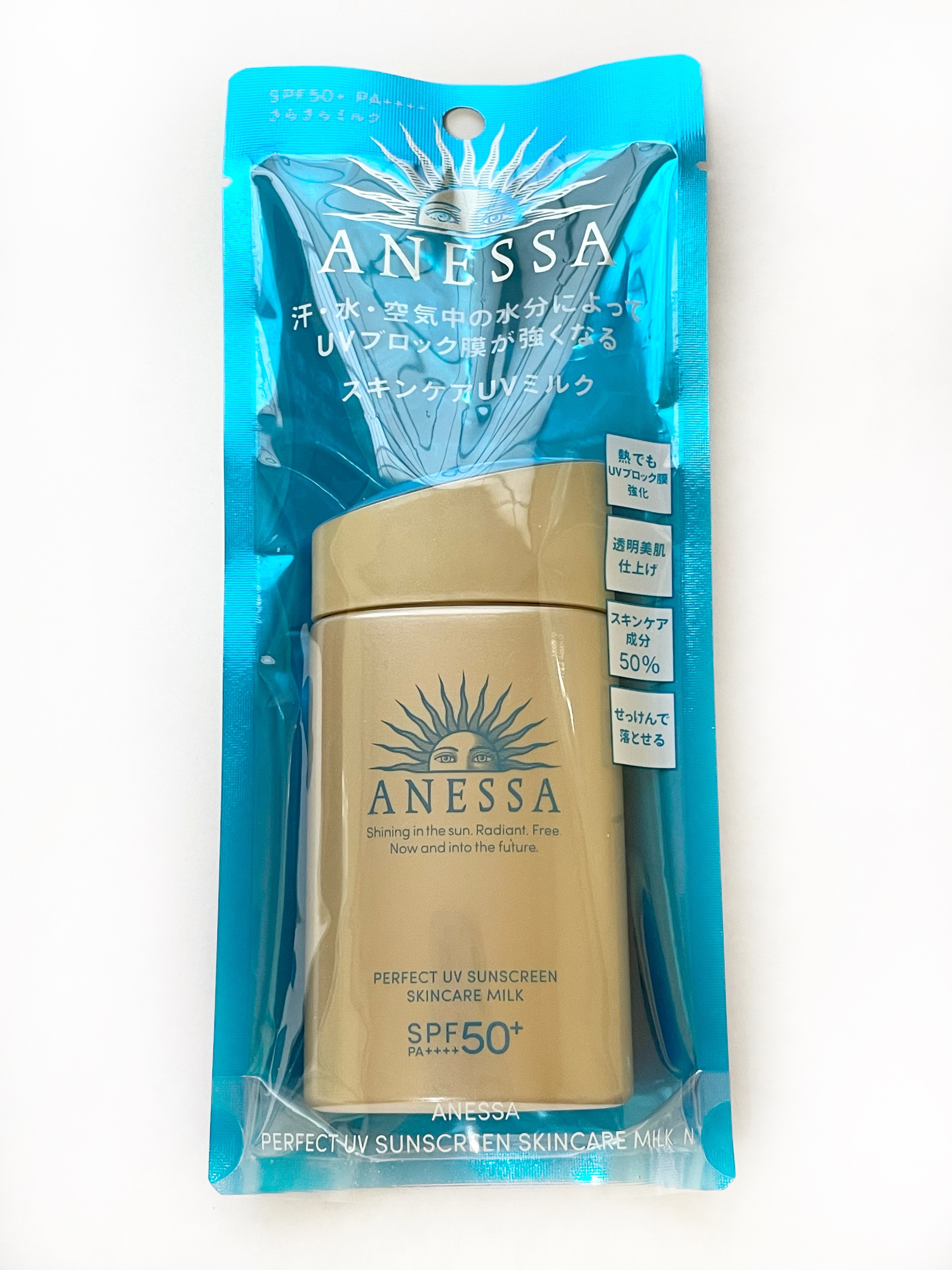 - 顔・からだ用 SPF50+ ・ PA++++ 汗、水、熱、そして空気中の水分に反応してUVブロック膜が強くなる技術搭載 最強※8 UVスキンケアミルク ※8 「最強」とはSPF50+・PA++++、及びアネッサ内ウォータープルーフ効果を意味する。 〇汗・水・熱、そして空気中の水分に自動的に反応して、UVブロック膜が強くなります。-オートブースター技術 〇透明美肌仕上げ-ビューティーアップ効果 “ビューティーアップ粉末”を新配合透明感のある美しいつや肌へ ○スキ ン ケア成 分 50% 配合 〇植物由来成分をブレンドした、紫外線による 乾燥 ダメージを防 ぐ 、うるおいを与える保湿美肌成分 黄花エキス、緑茶エキス、異性化糖、グリセリン 〇保湿 成分 コラーゲン、 スーパーヒアルロン酸※ 9 、 グリセリン ※9 アセチルヒアルロン 酸 Na 〇保湿持続 効果 ○スーパーウォータープルーフ 〇マスク蒸れ対応 〇耐こすれ ○化粧下地効果 ○せっけんで落とせ る 〇さらさらミルク ○生まれ変わった 、 心地よいフルーティーフローラルの香り 〇大気中に浮遊する微粒子、 PM2 .5 などから肌を保護 し ま す。-微粒子付着防止対応 ○砂が肌 につきにくいサンドプルーフ効果 〇海に流れ出にくいオーシャンフレンドリー処方※6 ※6 自社品内の耐水処方でない商品と比較 ○環境に優しいサステナブルなボトル ○植物由来の原料を一部使用した袋 〇オキシベンゾン 、 オクチノキサート無配合 ○無着色・ ノンコメドジェニックテスト・ アレルギーテスト済み (全ての方にニキビができない、アレルギ ーが起きないというわ けではありません)