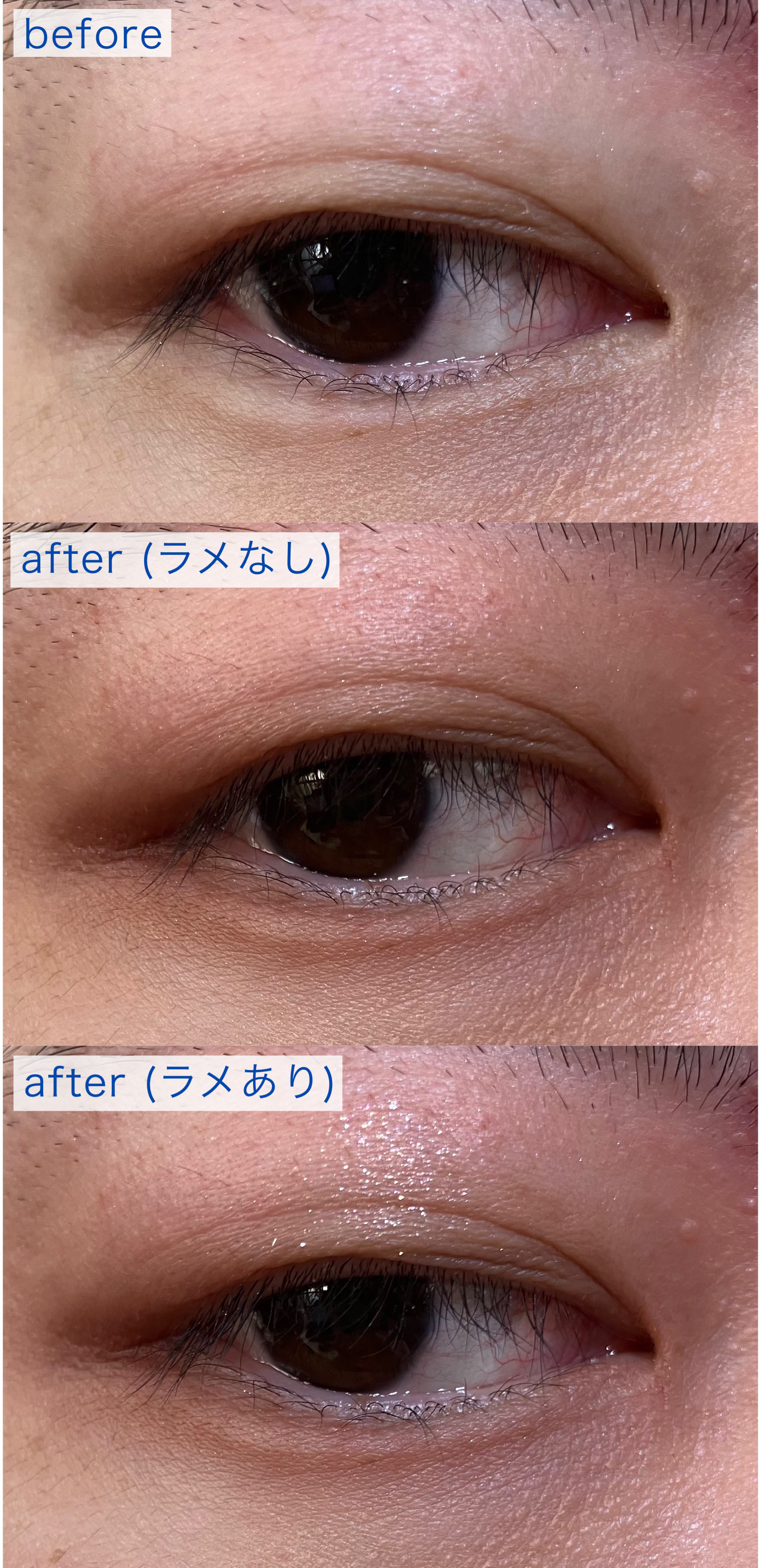 ラメ ピンク、白、ベージュなどの色が混ざっているように思います。 セミマット 青みも黄みもない淡いベージュです。わずかにパール感があります。 Cを上瞼の目尻のみにライン状に塗布します。