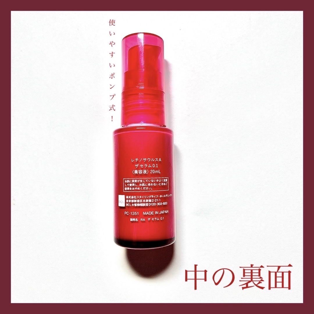 - 攻めのレチノール*1 +守りの潤いバリア! つるんと、むきたて卵肌にみちびくレチノール*1 配合美容液。 攻めと守りの処方設計でお肌が持ち上がるようなハリ感とツヤがあるむき卵肌に! 【攻】お肌にしっかり浸透*2 高濃度レチノール*1 ザ・セラム0.1配合 【守】お肌に必要な潤いと肌あれを防ぐ潤いバリア ・10種のペプチド*3 ・ヒト型セラミド*4 ・アラントイン(保湿) ・ビタミンB6 *5 ・ビタミンE *6 ご使用方法に十分ご注意ください。 〈ご使用方法〉 化粧水等でお肌を整えた後、パール粒1個程度を手に取りお肌になじませます。 その後、乳液やクリーム等を重ねてお使いください。 夜のご使用をおすすめしています。 朝ご使用する際は日焼け止めを必ずご使用ください。 1日1回程度のご使用がおすすめです。 *1 レチノール(整肌) *2 角層まで *3 アセチルヘキサペプチド-51アミド、アセチルヘキサペプチド-8、オリゴペプチド-20、オリゴペプチド-24、カプロオイルテトラペプチド-3、テトラペプチド-30、トリペプチド-1、パルミトイルトリペプチド-5、ヘキサペプチド-33、ペンタペプチド-18 *4 セラミドEOP、セラミドNG、セラミドNP、セラミドAP(以上、全て保湿) *5 ピリドキシンHCl(整肌) *6トコフェロール(以上、全て整肌)