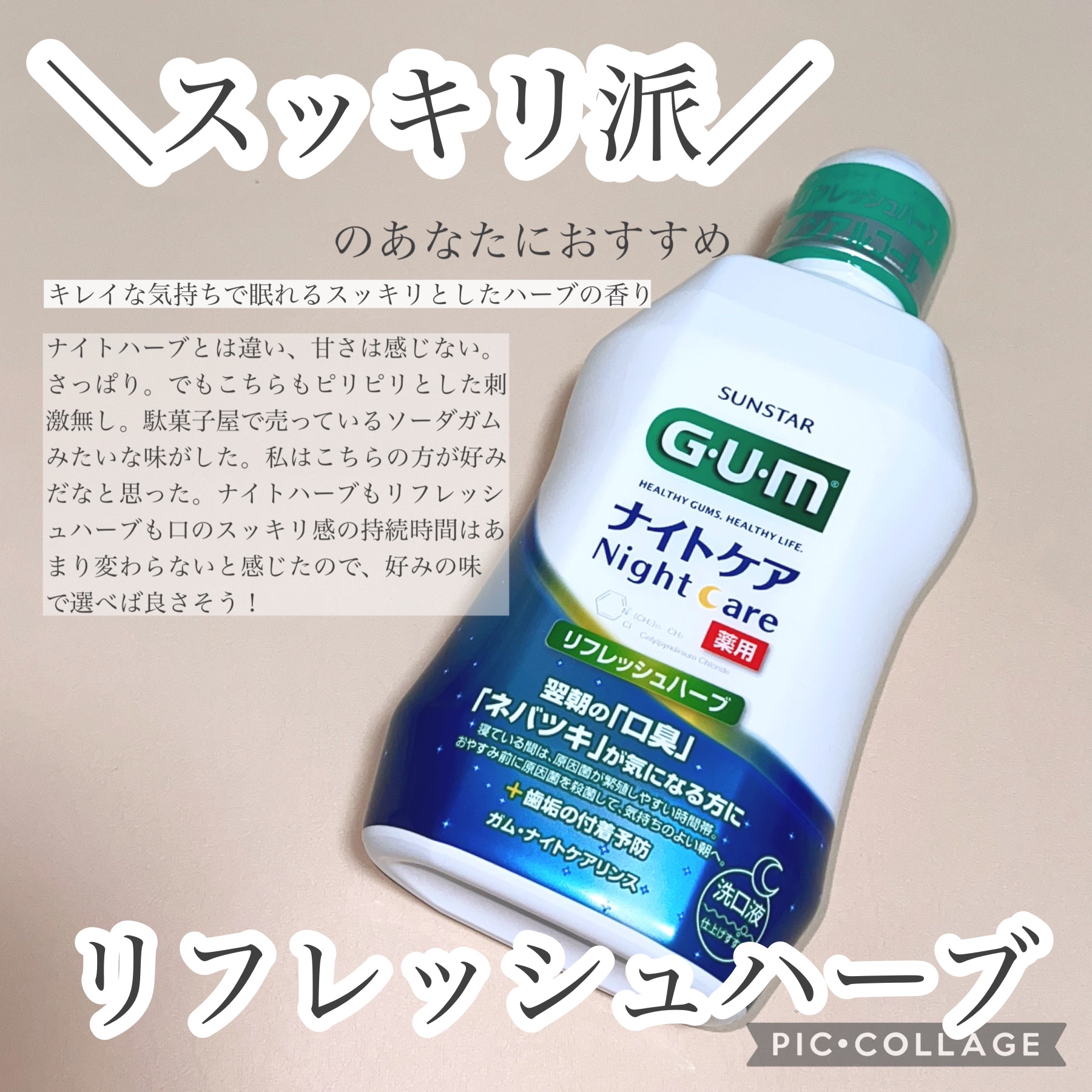 ノンアルコールで刺激が強くないので、使いやすいなと思いました!しっかり口の中がスッキリします✨️ 夜寝る前に、お口の中がすっきりするのでおすすめだなと思いました! ナイトハーブとリフレッシュハーブの2種類のうち、リフレッシュハーブを購入しました!