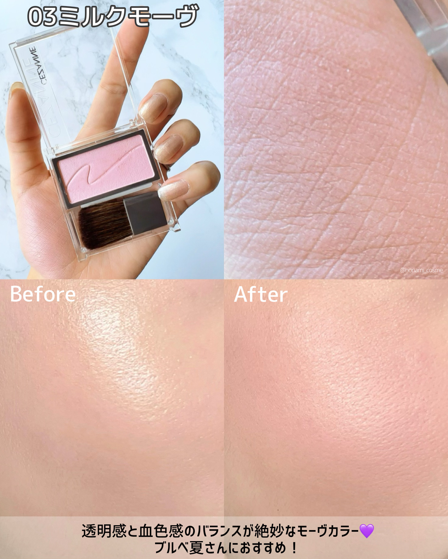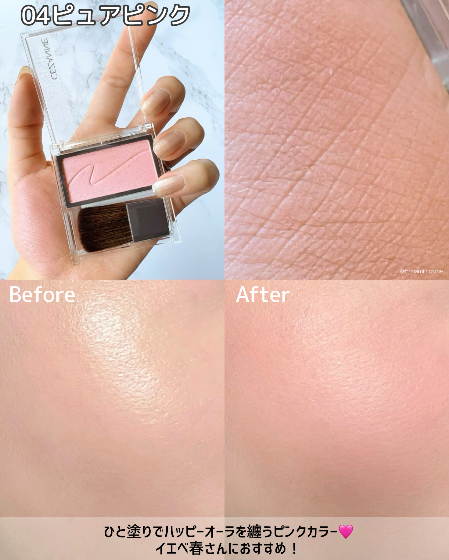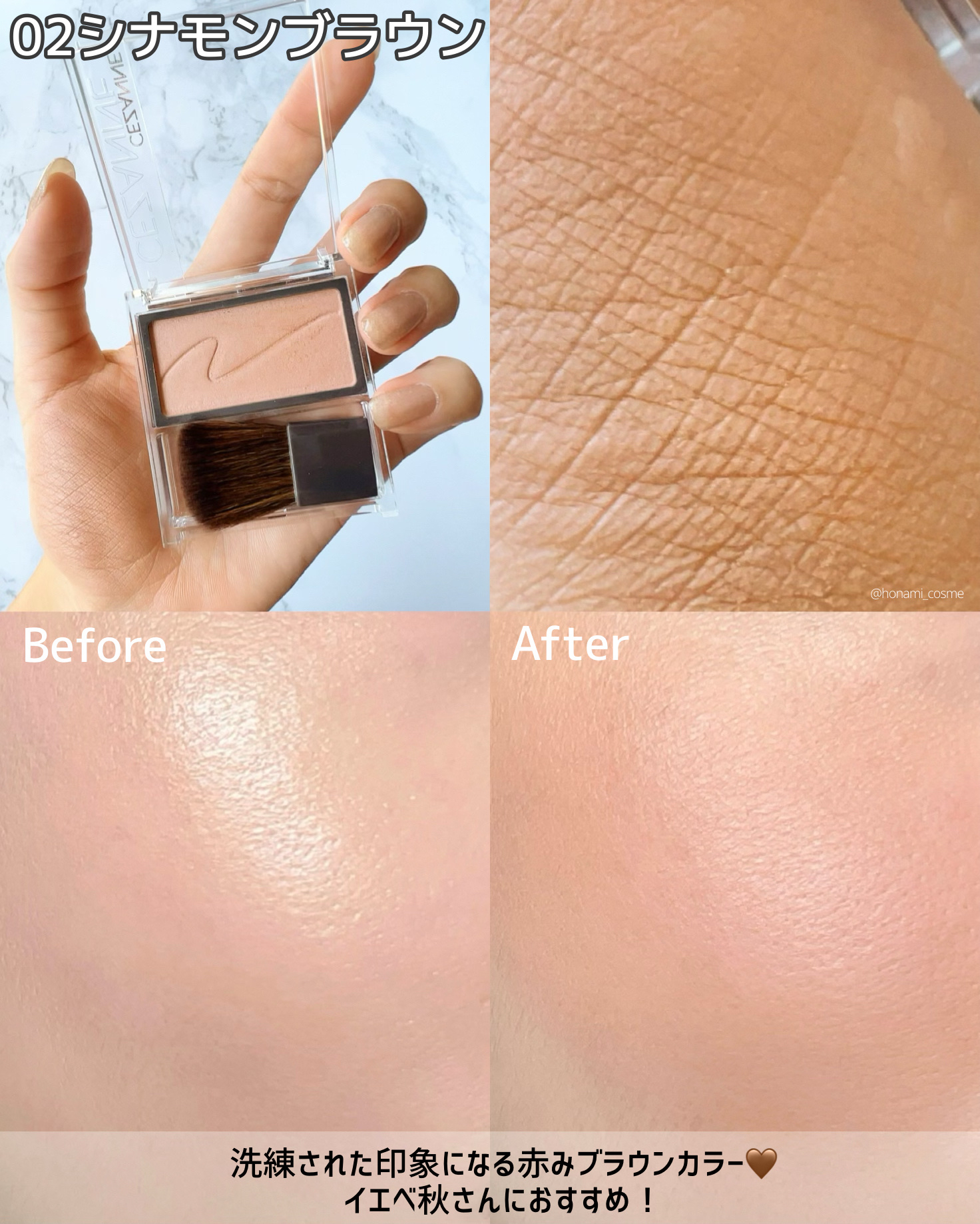 密着性が高く頬に馴染み、まるで肌の内側からにじみ出るような自然な血色感を演出します。 肌馴染み抜群!!しっかりつけても、ムラになりにくく、肌馴染みもとってもいいです!! とにかく使いやすく、肌馴染みも抜群で、失敗知らずなチークと言ったらこれ!!♡