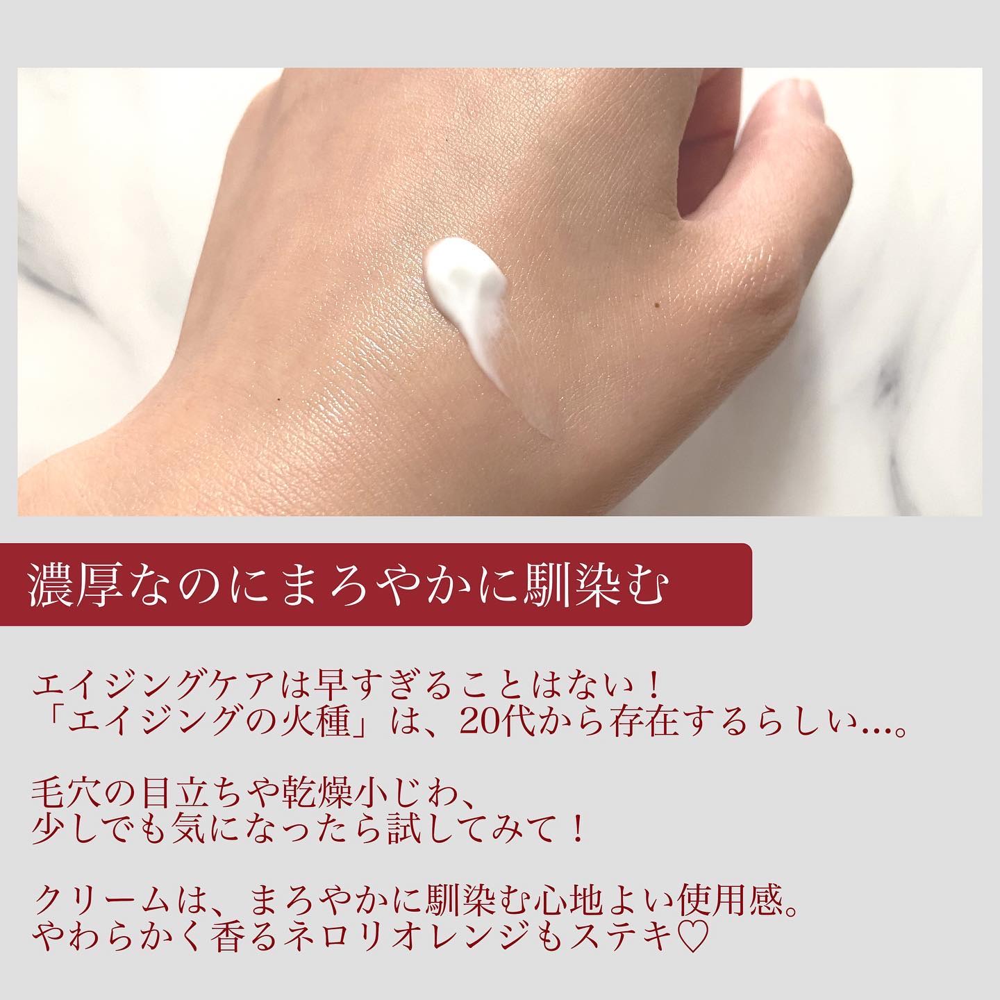 - 複合的なエイジングサインの根本原因である〝エイジングの火種〟に着目。 新サイエンスに基づくクリーム。 ピテラTMとキンレンカエキス、シャクヤクエキスを選び抜き、進化したマイクロパーティクル処方にのせて角層のすみずみまで届けます。 まだ気づいていないエイジングサインから今ある肌悩みまで、包括的にアプローチ。 クリームでありながら、美容液のようにするりとなじんでいく浸透感、すべるようになめならかな後肌感... 新感覚のテクスチャーにもこだわり抜きました。 柔らかくみずみずしいネロリオレンジの香り。