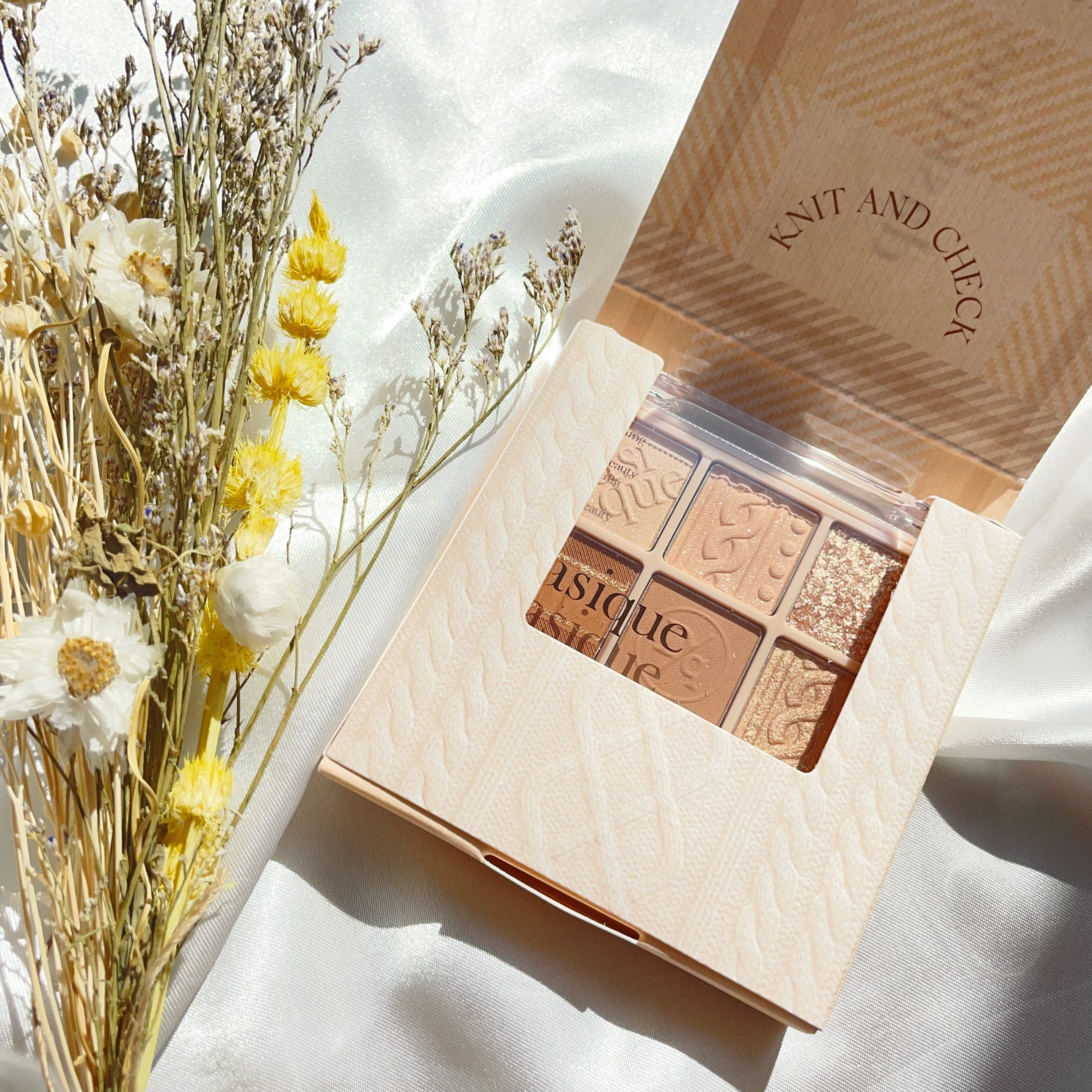 ふんわりベージュニットトーンにパール、チェックパターンを加えたウォームニットパレット🧶🎨 粉飛びもしにくく、グリッターも密着力抜群❤️🔥 ラメもキラッキラで最強に可愛い🐰 これ一つあれば思い通りのブラウンアイメイクができます☺︎ ぜひチェックしてみてね💫