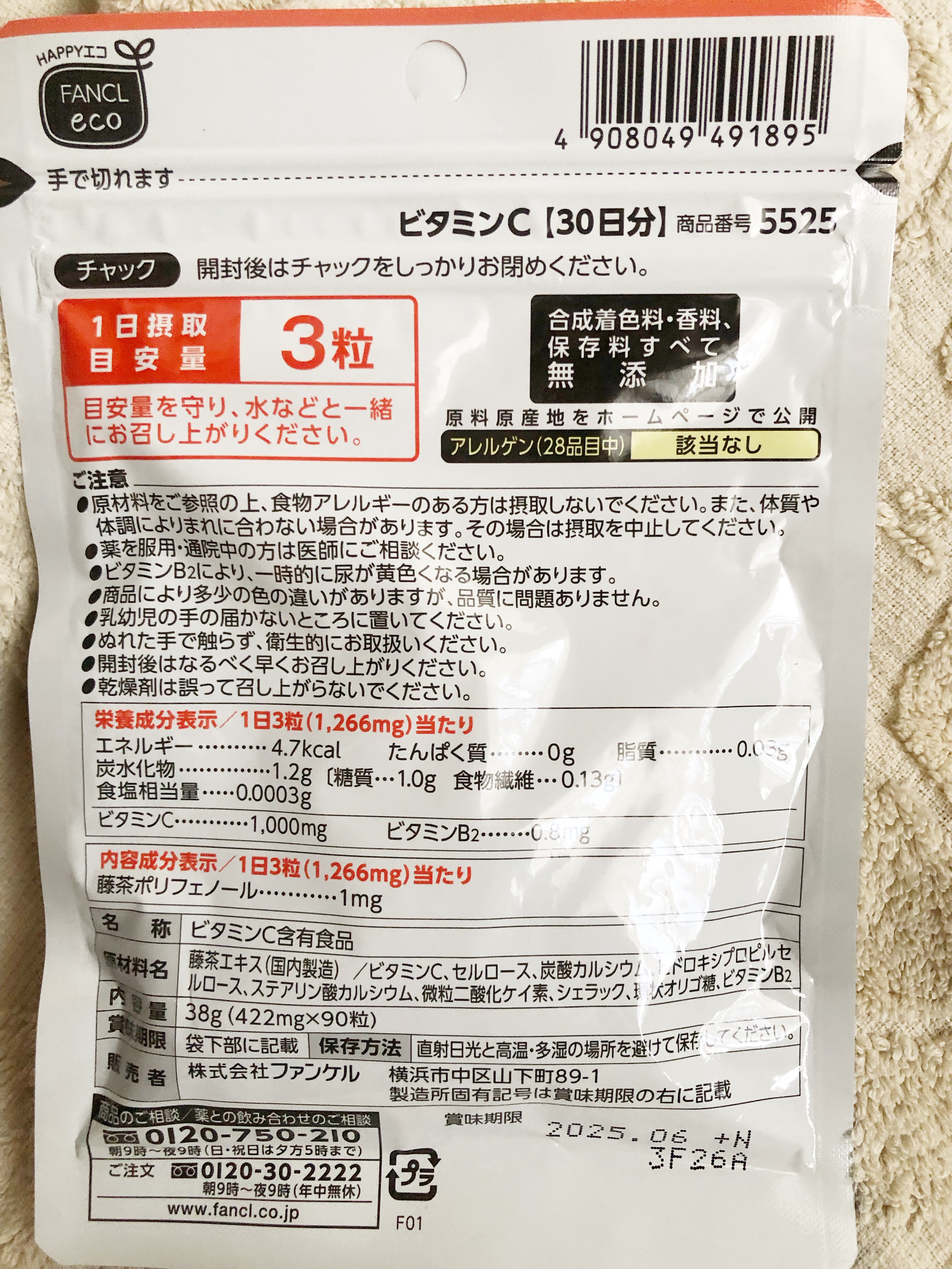 - 1日当たり1,000mgのビタミンCとサポート成分藤茶ポリフェノールを配合した、摂りやすい錠剤タイプ。体本来の力、美容にもアプローチするビタミンCは健康的な毎日のために必要な成分。水溶性のビタミンだから分けて摂るのがおすすめです。 【1日の目安】 3粒 【主要成分/1日3粒当たり】 ビタミンC:1000mg、ビタミンB2:0.8mg、藤茶ポリフェノール:1mg 【アレルゲン(28品目中)】 該当なし