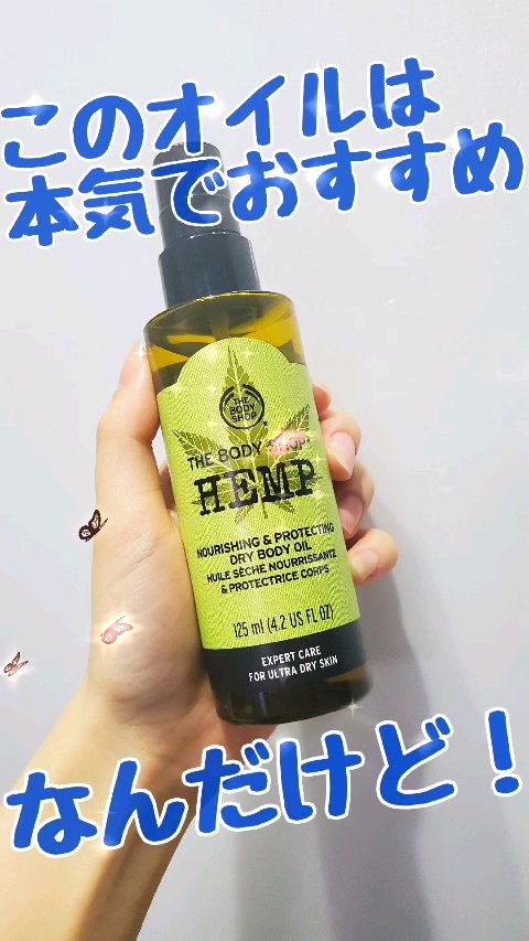- <ボディ用保湿オイル> 天然由来成分98%配合 一滴に、植物の恵みがギュッ! パチュリやウッド、ゼラニウムなどの心落ち着くような穏やかな時間を演出するスージンググリーンの香り 天然保湿成分ヘンプシードオイルを贅沢に配合したボディ用保湿オイルです。 乾燥して固くなった肌にも、すっと溶け込んで角質層まで素早く浸透。シーンを選ばず手軽に使えるスプレータイプのため、乾燥が気になる時にいつでもシュッとひと吹き。 ブースターとして、ドライボディオイルの後にボディクリームやボディローションでうるおいを閉じ込めると、輝くようなツヤに満ちた肌へ。合わせ使いもおすすめです。 乾燥によるかさつきやごわつきが止まらない超ドライスキンの方も、ザボディショップで20年以上愛され続けるヘンプシリーズのしっとりしたうるおいを是非お試しください。 ーPointー 1.ピュアな美容保湿成分を集中補給 2.かさつきやすく乾燥によるくすみの気になる肌も瞬時にしっとり。なめらかで輝く肌へ。 3.オイルなのにべたつきが少なく、素早くなじんで、サラッとした仕上がりに。
