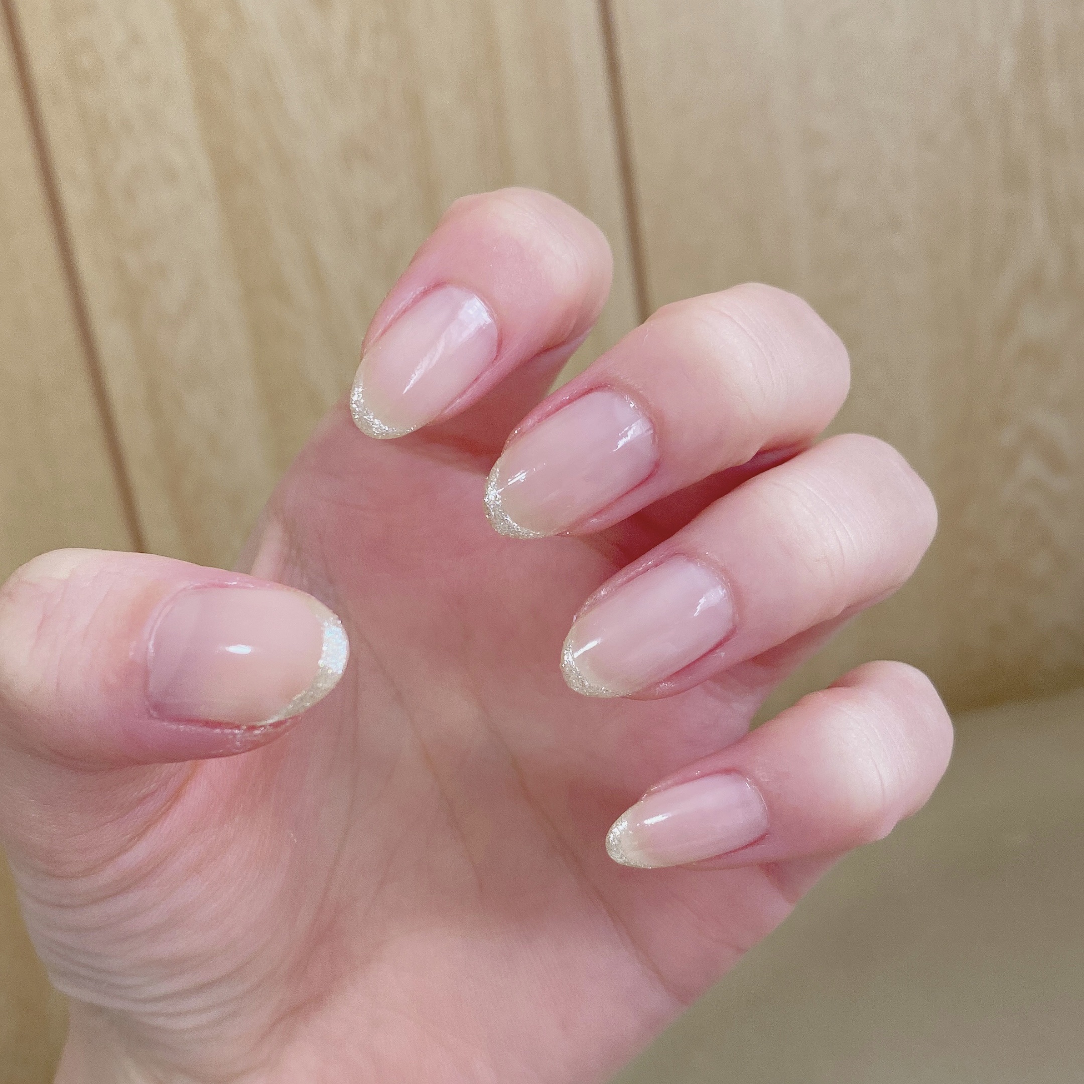 全体的にキラキラして可愛いです🎶 セリアで購入したキラキラのパーツをのせてみました!✨️ 持ちは1週間弱ですが本当にペロっと剥がれてジェルネイルなのに爪が傷んでないです!