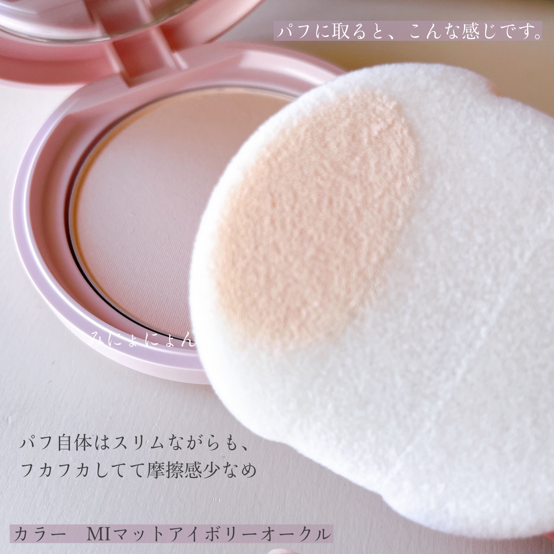 ふわふわ、すべすべ マシュマロのような質感の肌作りができるフェイスパウダー! MI マットアイボリーオークルはやや白みが強く、明るいカラー。 時間が経ってもくすみにくいです。 ツヤ系ファンデやクリーム系チークと組み合わせるとヘルシーな雰囲気と透明感が引き立つ上品な仕上がりになり、写真映りも良好。