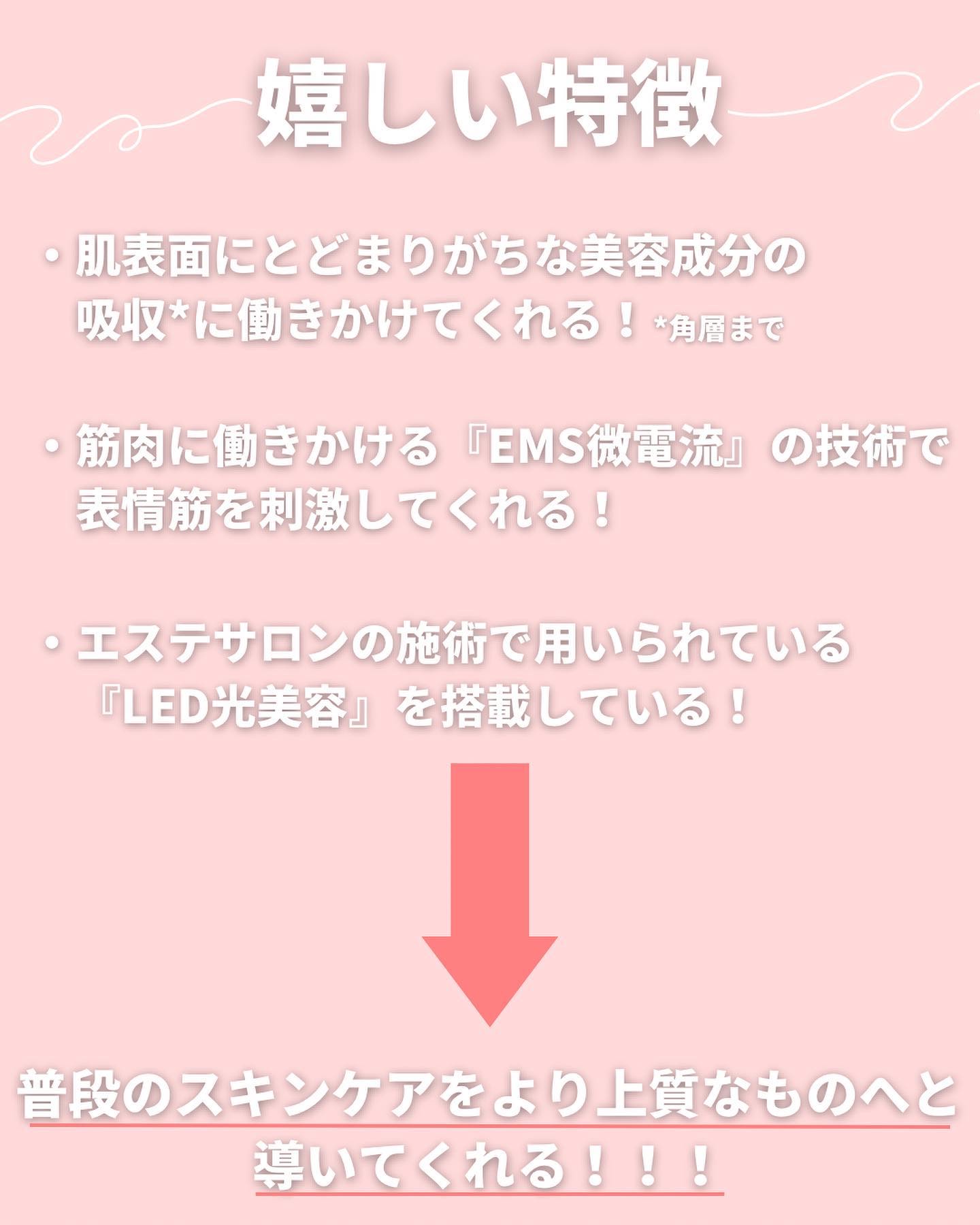 - 肌表面〜筋肉に電気刺激を与え化粧水の浸透*から表情筋の刺激まで行うEMS複合美顔器。 エステサロンの施術で用いられるLED光美容搭載で肌本来の力をサポートし、普段のスキンケアをより上質なものへと導きます。*浸透は角質層まで トリートメントヘッドにプラチナメッキを使用しておりますので敏感肌の方や、しっとりとしたきめ細やかな肌を保ちたい方におすすめです。 縦120mm×横57mm×奥行29mm