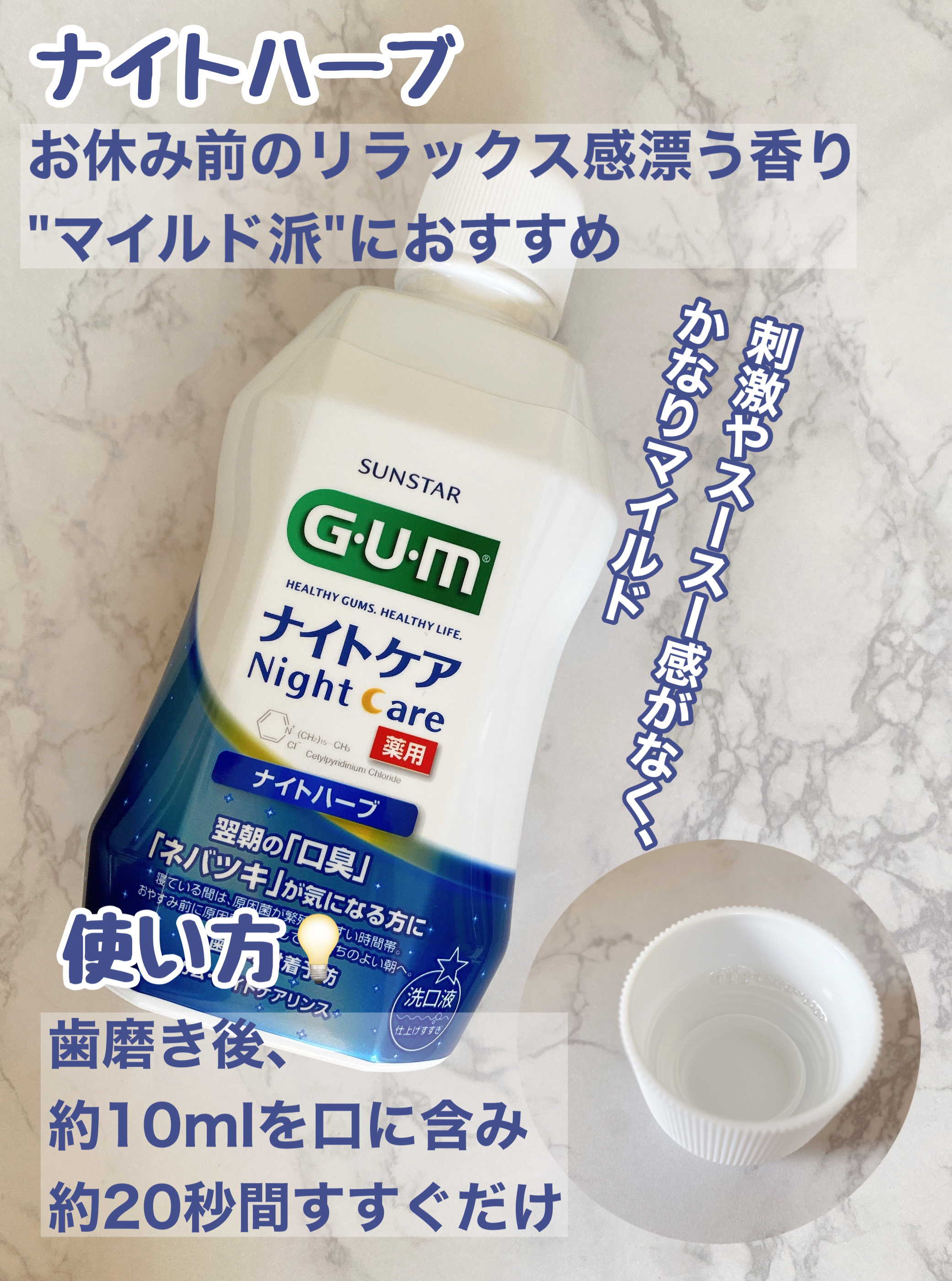 ノンアルコールで刺激が強くないので、使いやすいなと思いました!しっかり口の中がスッキリします✨️ 夜寝る前に、お口の中がすっきりするのでおすすめだなと思いました! ナイトハーブとリフレッシュハーブの2種類のうち、リフレッシュハーブを購入しました!