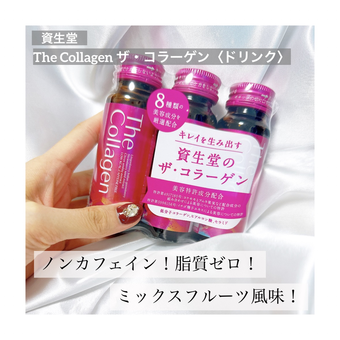 毎日寝る時に私が飲んでいるコラーゲンドリンク。 低カロリーだし、脂質ゼロでノンカフェイン! 味は飲みやすいミックスフルーツ風味だよ♡ よく冷やして、よく振って飲む! 毎晩の私の楽しみになってるよ♬