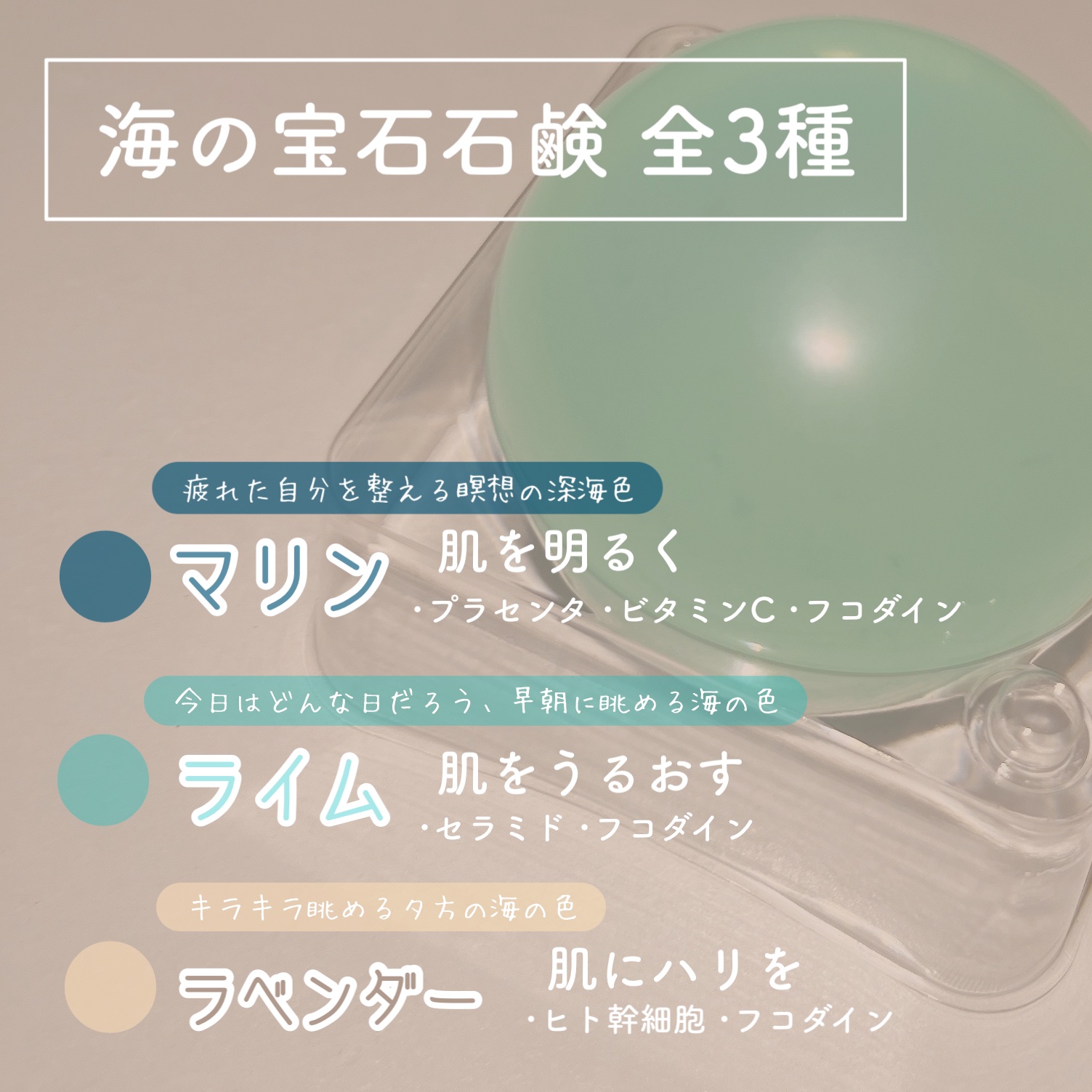 - ・ゼリーのような「ぷるんぷるん」と柔らかいドロップソープは、美容成分を贅沢配合した美容液のような洗顔石鹸です。含まれている美容成分の種類の違いにより、マリン、ライム、ラベンダーと3種類が用意されています。 ・このマリンに含まれている美容成分は、ビタミンC、プラセンタエキスの整肌成分。フコイダンを中心とした、ヒアルロン酸、プラセンタなどの保湿成分をふんだんに配合しています。 ・固形石鹸でありながら保湿美容成分を贅沢に配合することを実現。ぷるんぷるんのゼリーがその秘密!かわいいだけじゃない、高機能な石鹸です。 ・アミノ酸系洗浄成分を使用しているので、泡も肌にやさしい使い心地、毛穴まで*美容成分が浸透します。 乾燥肌や敏感肌の方にも。洗い上がりはしっとり、もっちりした仕上がりで 肌印象が明るくなる”うるツヤ肌”へ *角質層まで ・不思議な感触のドロップソープは風船に包まれているので、付属の楊枝で穴をあけて石鹸を取り出します。最初に手にした方は「これが石鹸なの?」とビックリすることでしょう。使用感、触っているときの心地良さを追求したぷるぷる洗顔です。 ・日常的な洗顔の手入れに活躍するのはもちろん、お誕生日、母の日など女性向けのプレゼントにはもってこい!もらった方が驚き、喜ばれること間違いなし!また、最近流行りのメンズ洗顔用としてのプレゼントもありですね! ・主な保湿成分であるフコイダンは、海藻から抽出された成分で見えないベールで大切なお肌を包み込んでくれます。一度洗顔すると毎朝、夜の洗顔が楽しみになるはすです!更に洗顔と一緒にハンドケアもできちゃいます! ・日常の朝晩の洗顔で約2ヶ月ぐらい長持ちするので、トータルなコスパも悪くないです。
