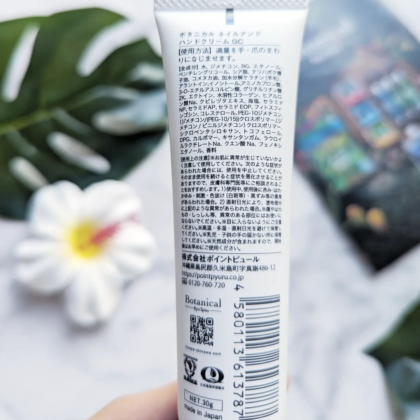 沖縄・久米島の海洋深層水をベースに、沖縄らしい自然素材を使用したスパブランド Ryu SpaのBotanicalシリーズ 珍しい海ぶどうのハンドクリームです 海ぶどうに含まれる「クビレヅタエキス*(海ぶどうエキス)」 *保湿成分 爪、ささくれをケアするボタニカルオイル(タマヌ・シアバター) 配合で爪先までケアしてくれます みずみずしいテクスチャー 伸びがよく、さらっとした使用感でペタペタも気にならないです スプラッシュマリンの香りは爽やかで癒されます ユニセックスで使えそうな香り 南国感のあるパッケージデザインやなかなか見かけない珍しい素材でプレゼントに喜ばれそうです 海ぶどうの他にも、シークワーサー、アロエ、アセロラなど、沖縄らしい自然素材のラインナップチェックしてみてください 使用感も乾燥肌〜脂性肌肌質によって選べるようになっています