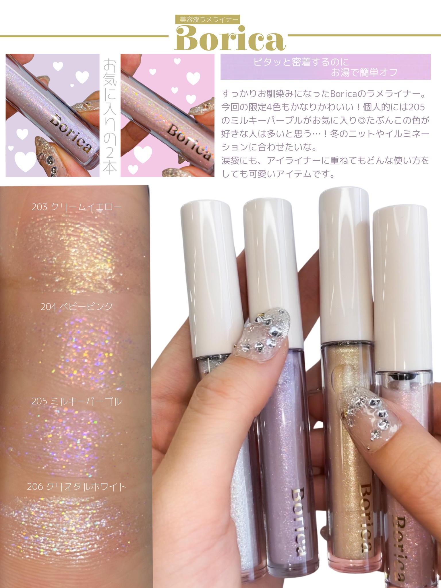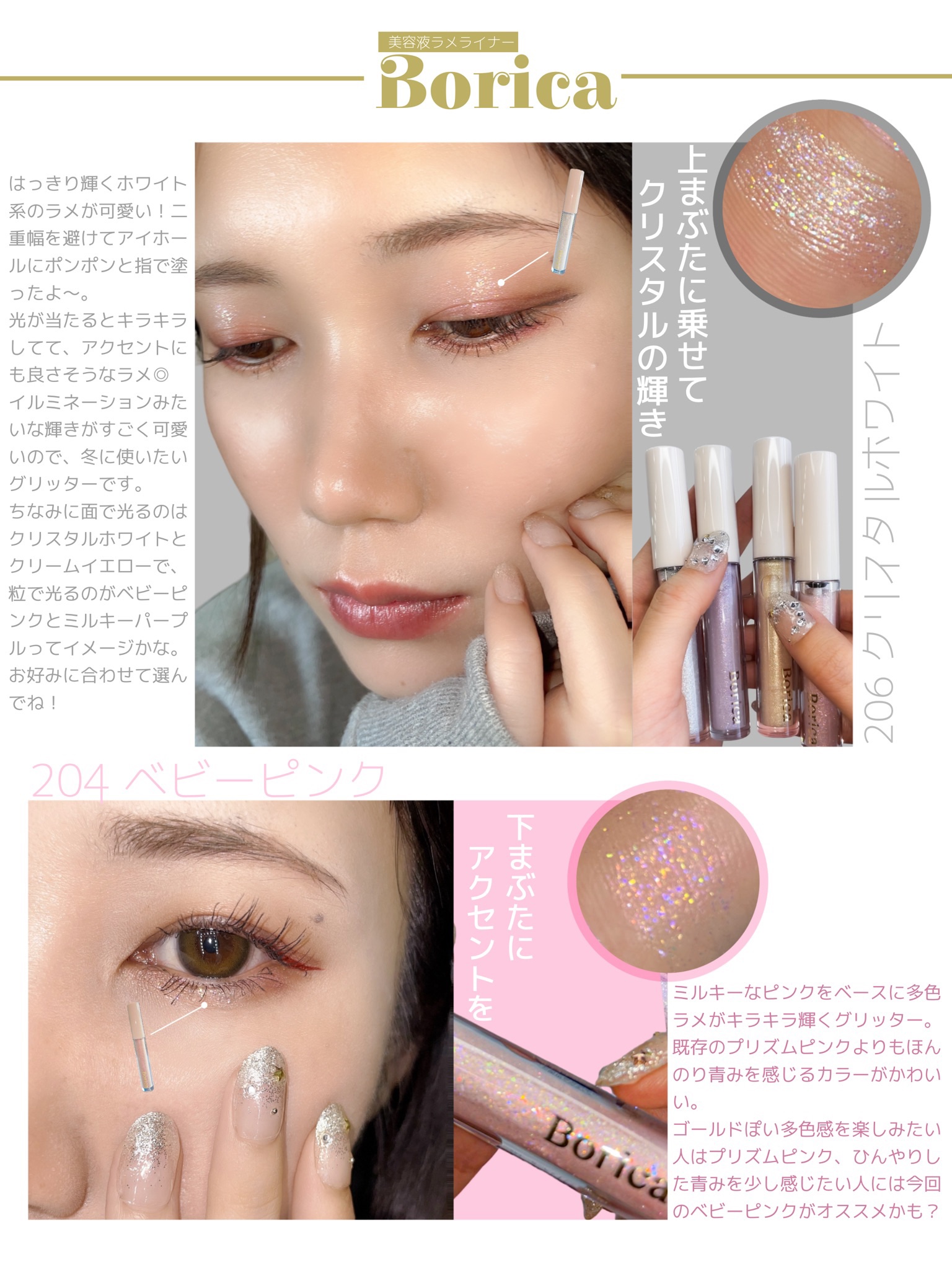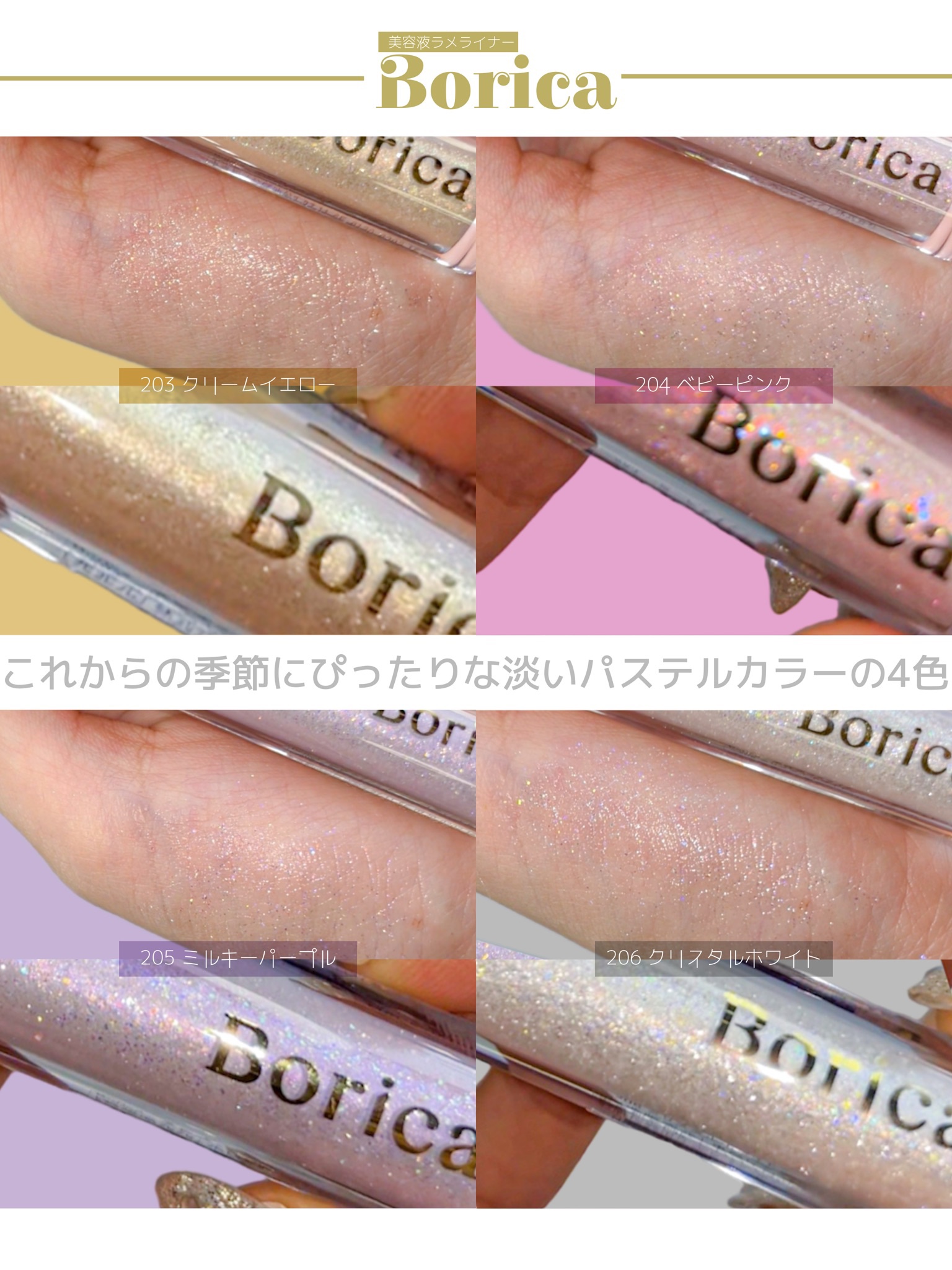 Borica美容液ラメライナー101クリアゴールド102クリスタルブルー201プリズムピンク202プリズムボルドー203クリームイエロー204ベビーピンク...